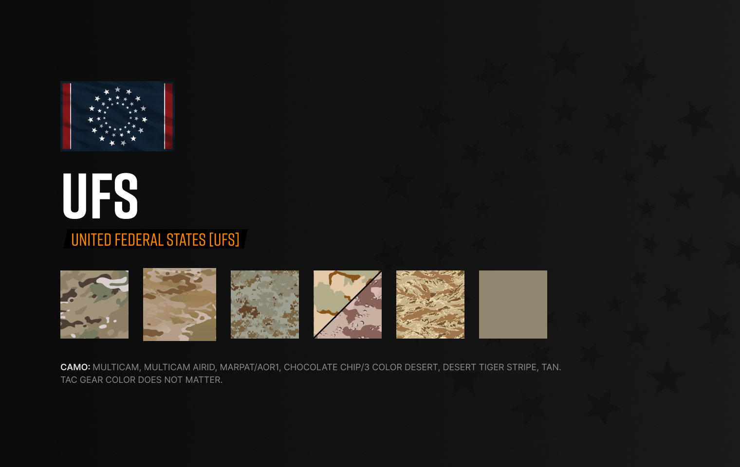 ONLY The following UFS Uniform(s) will be allowed - Players not adhering to the uniform restrictions will be removed from the AO until their uniform is CORRECT.