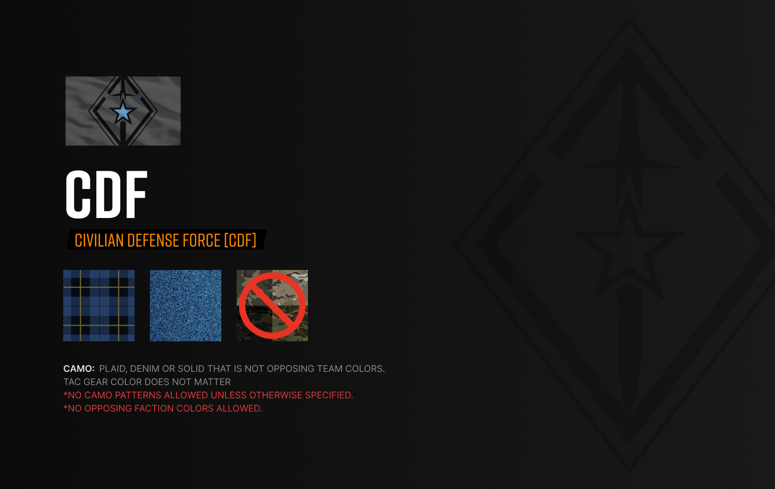 ONLY The following CDF Uniform(s) will be allowed - Players not adhering to the uniform restrictions will be removed from the AO until their uniform is CORRECT. Civilian attire required. Denim, Plaid etc. (No Red), and NO OPPOSING FACTION ( at event) COLORS (no green) including headgear/facegear, other gear color does not matter. NO CAMO patterns at all. MUST BE SOLIDS. IE. TAN, Brown, black, white, all plaid but tan is ok.