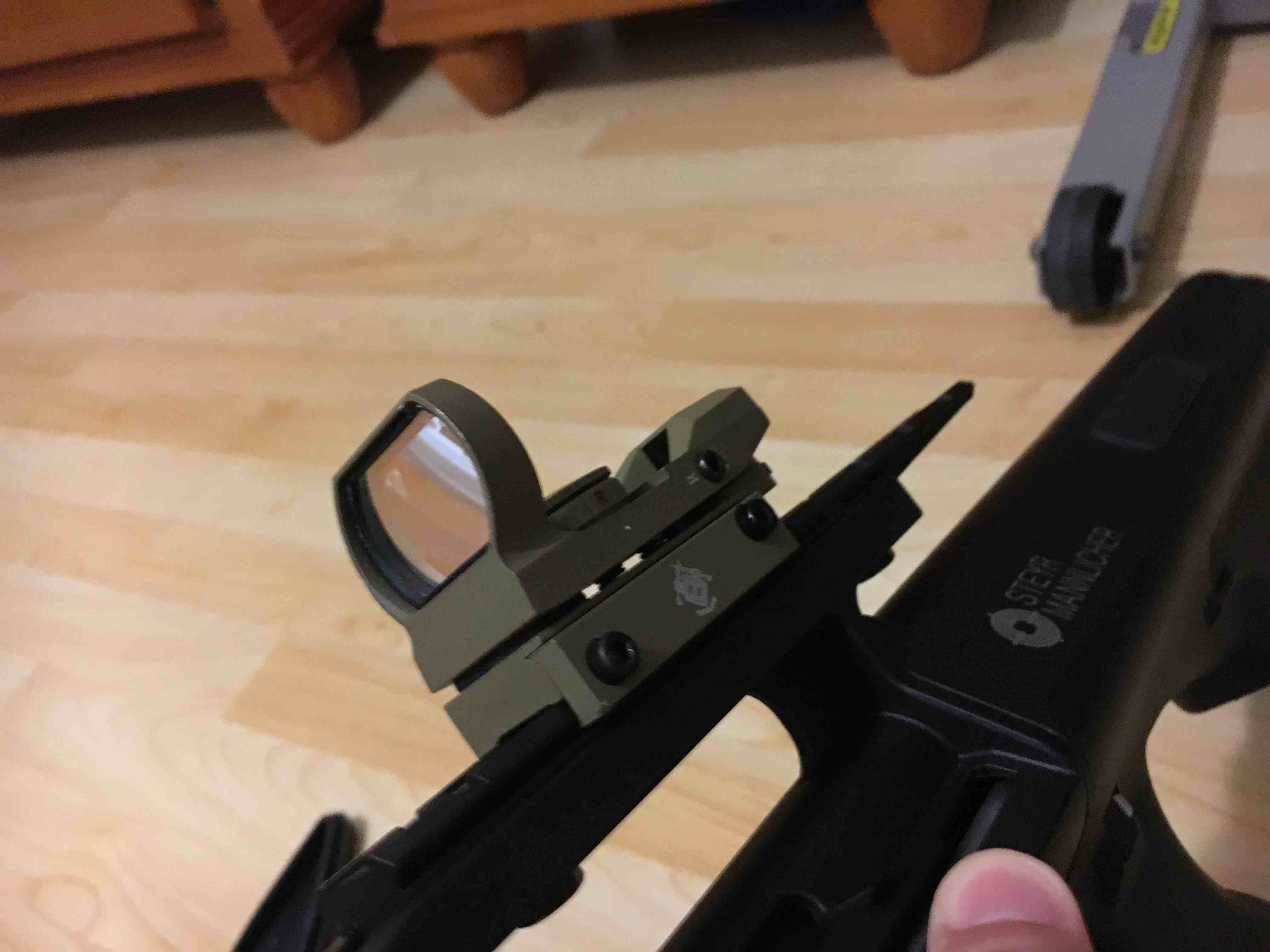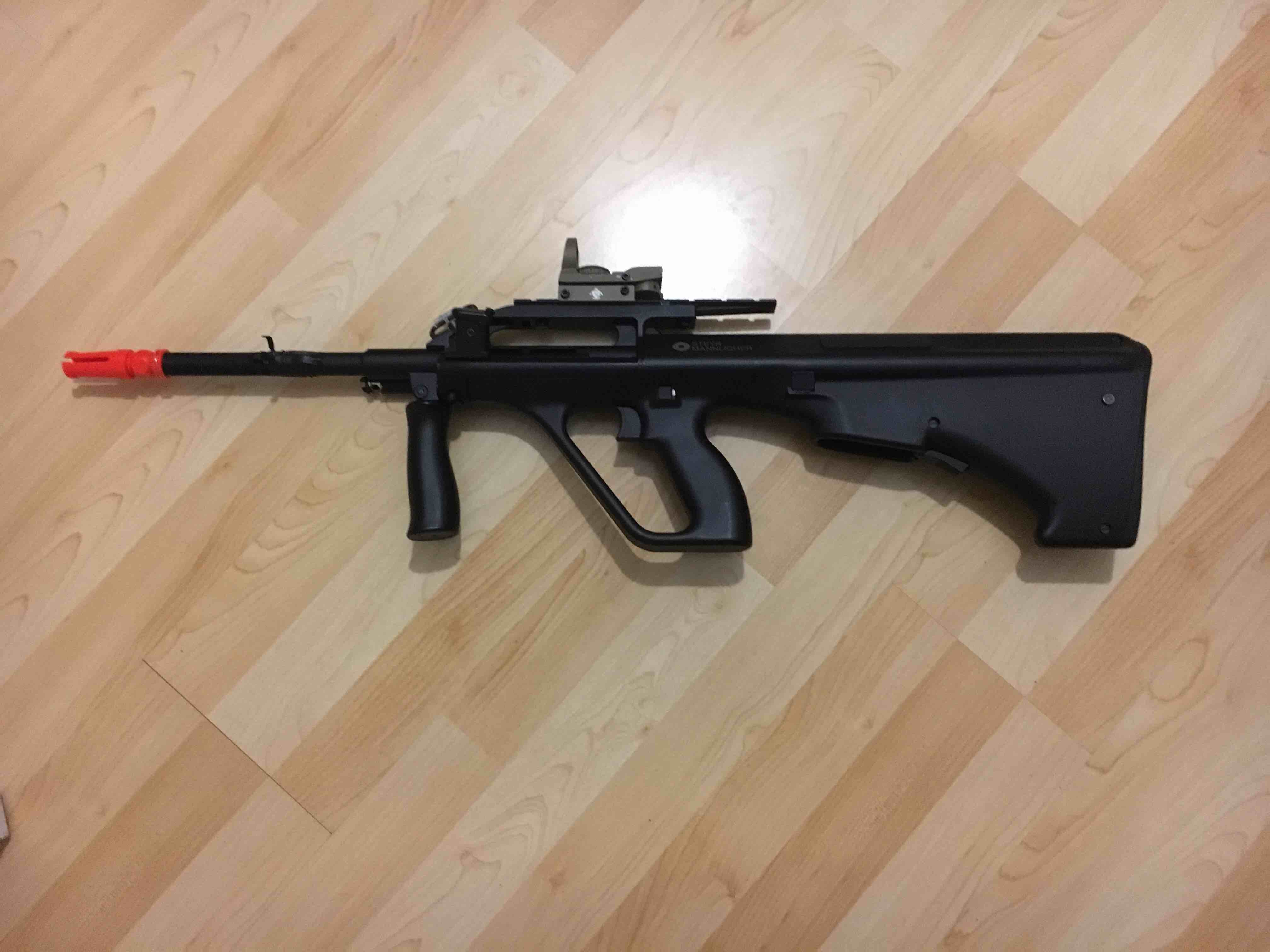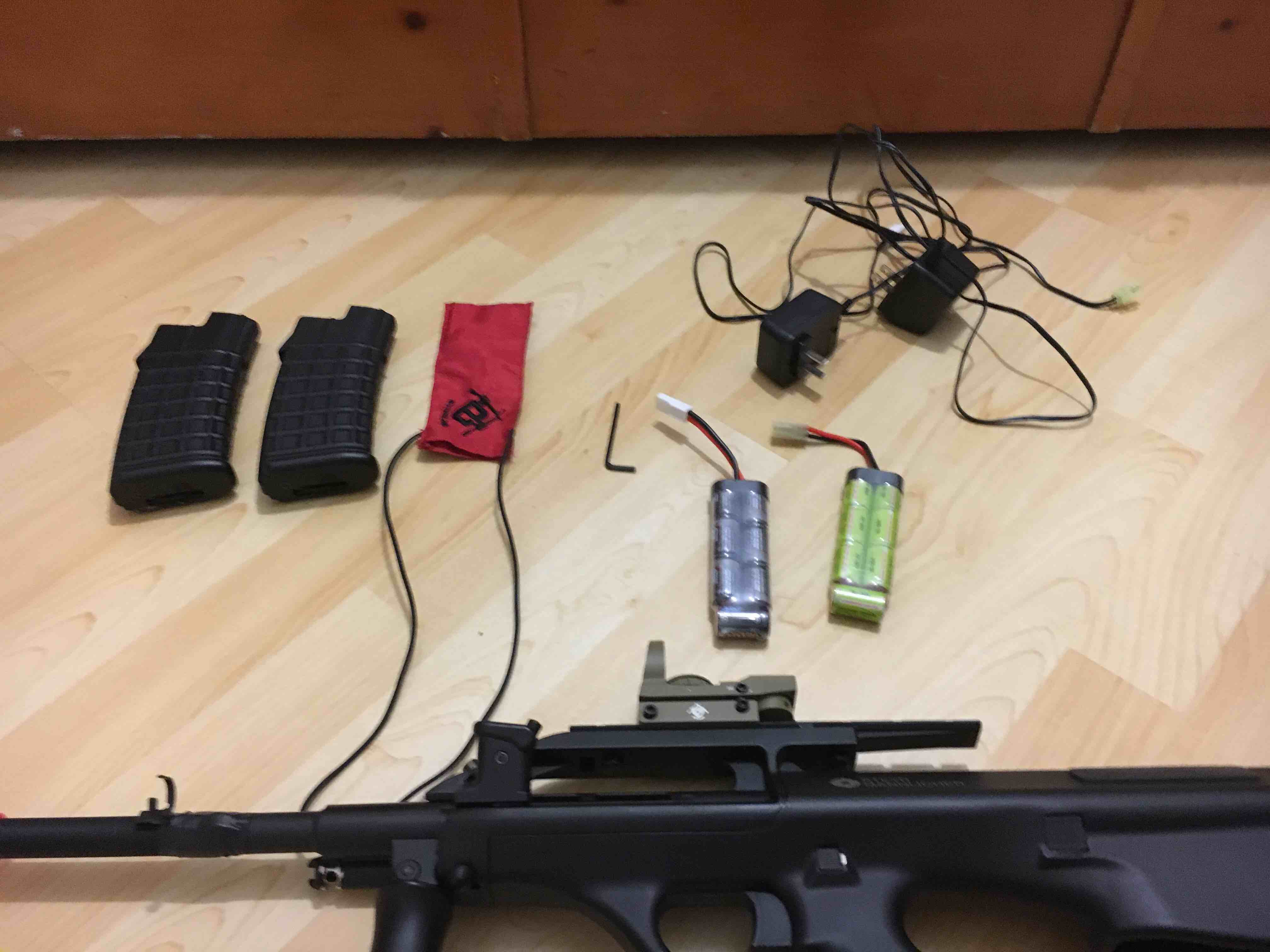 6mm barrel 2 batteries with 2 chargers 2 mags Iron sights 300 fps Barrel protector Red dot sight