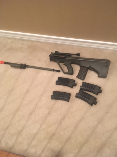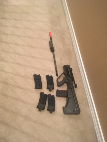 ASG Steyr Aug a2, the barrel has a broken hopup but a 6.01 tightbore barrel pre-installed. Comes with 2 high-cap mags and 3 mid-caps with magpul grips on them. Buyer pays shipping