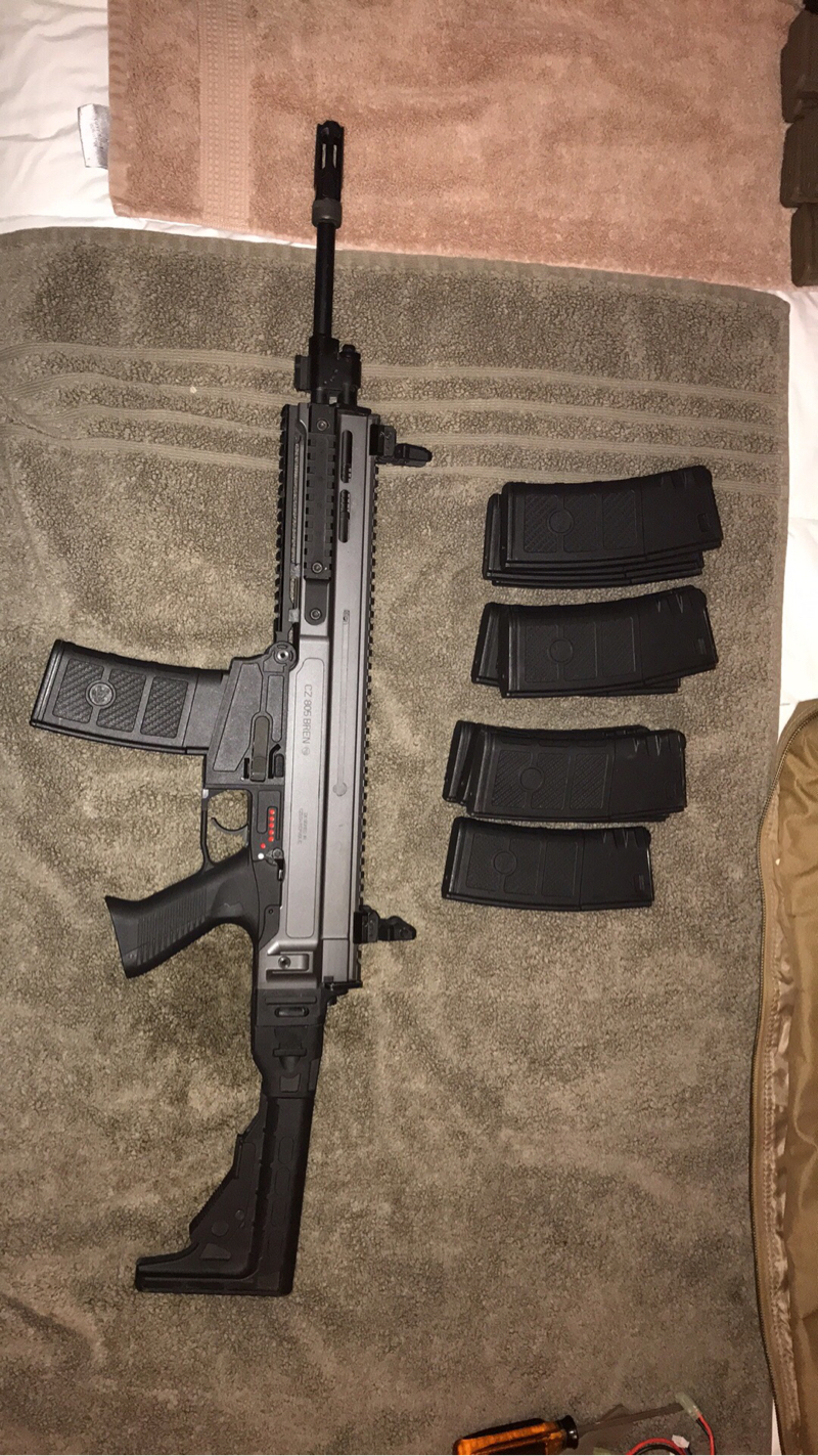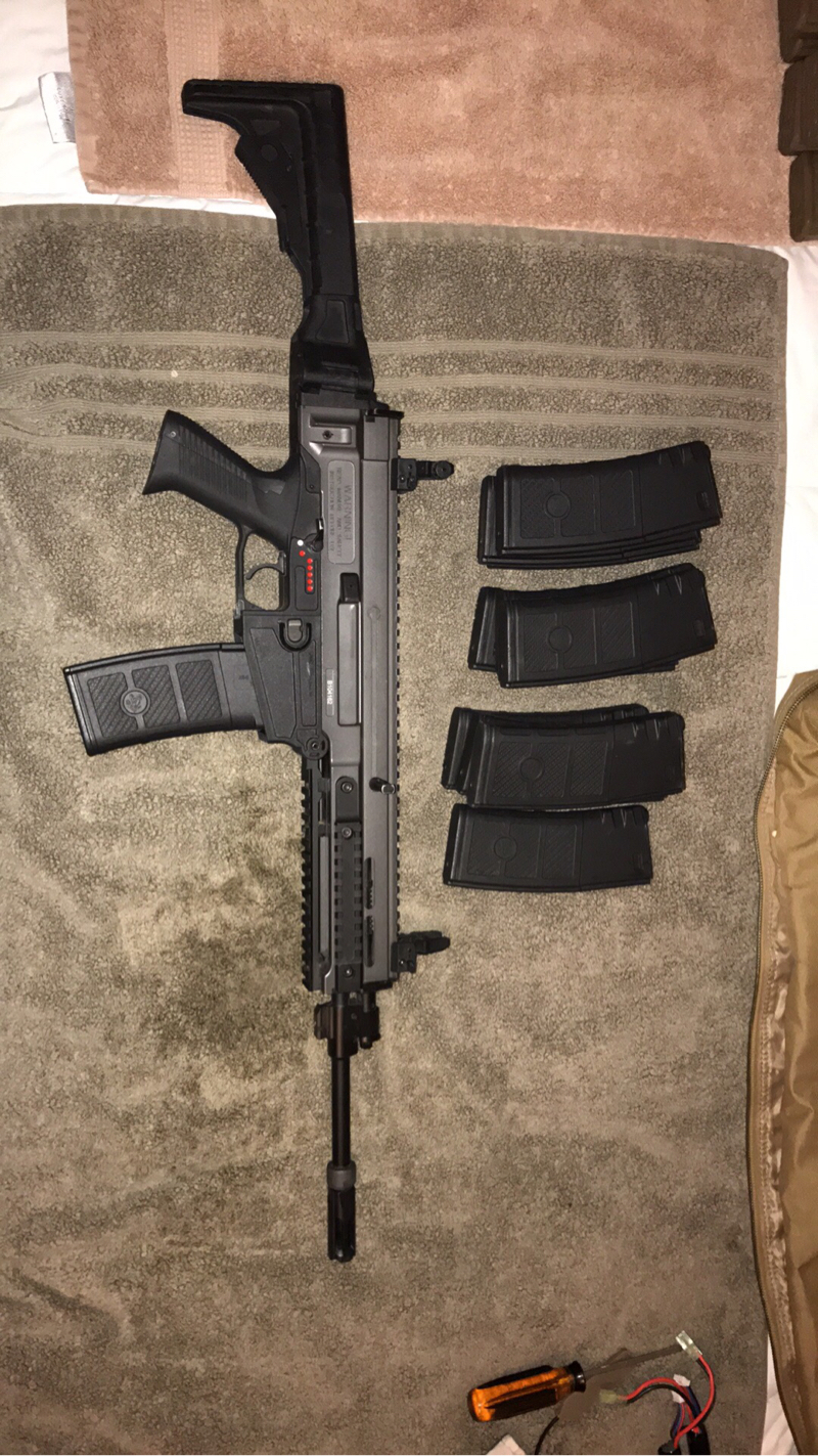 Here's my fully functional CZ 805. Comes with 11 Frog mags, all of which work amazing. Has the stock Krytac Defiance Flashhider. Does NOT have the stock cheek pad as I took it off to aim down the sights with my mask and lost it.