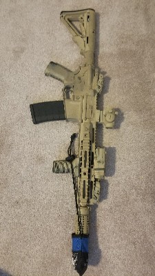 red/green dot sight, green laser mock peq box, magpul flip up sights, mock suppressor (quick release), vertical grip, magpul furniture all included.