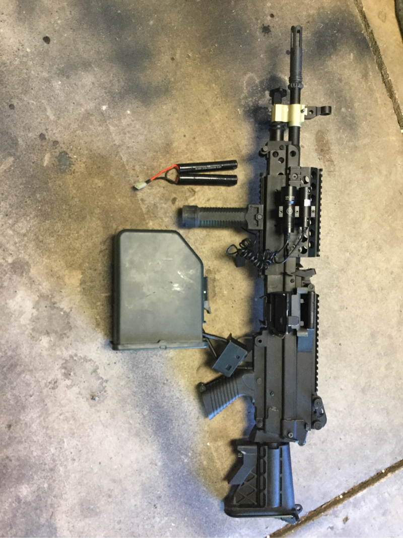 It shoots at about 400 fps, has a 2500 round box-mag and a 9.6v battery. Overall a very good gun no issues