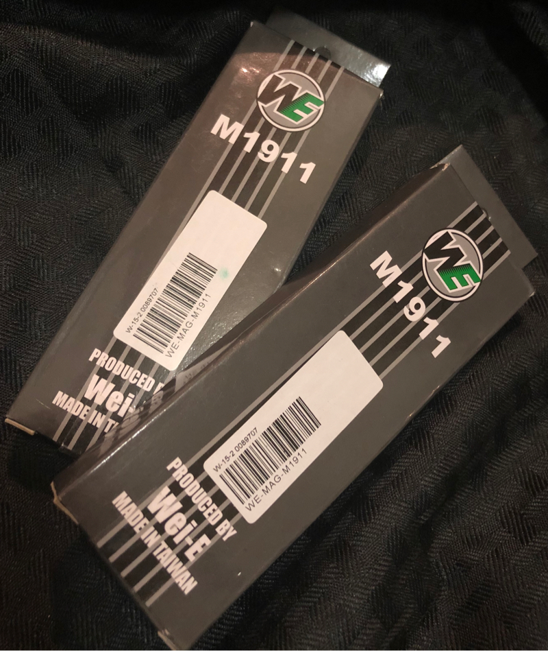 Brand new, price includes shipping. WE-Tech M1911 15rd single stack magazine. Two units available, will take money off for taking both. Green gas versions. PayPal only. Thanks!