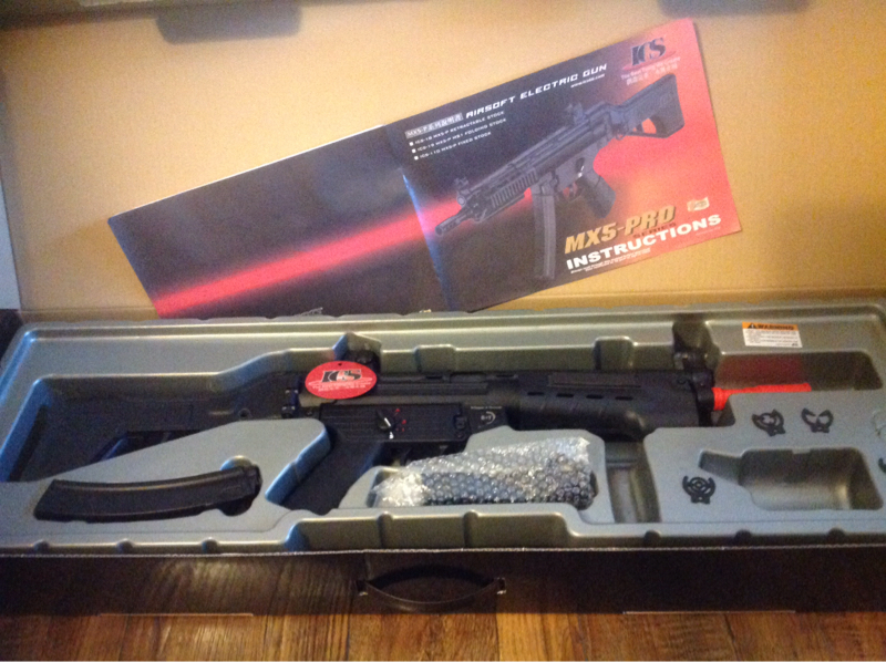 Stamped steel upper receiver, front wired, folding stock, ICS split gearbox. Even has 5 adjustable custom front reticles for the iron sights.