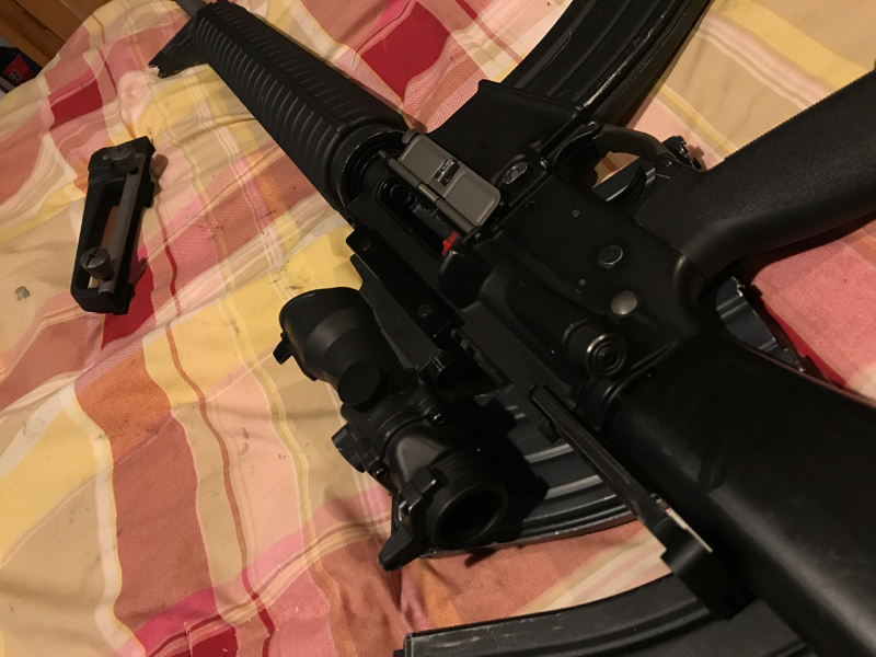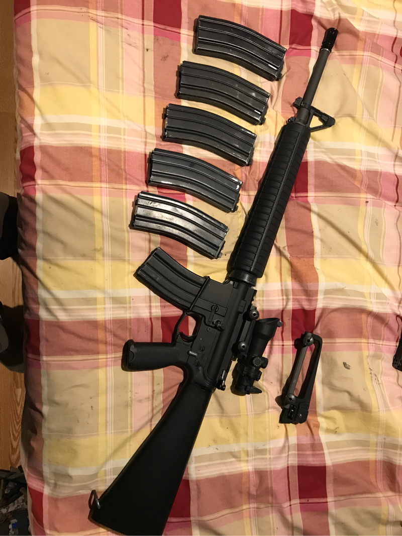 This is my back up rifle so I don't really use it much and don't need it anymore since I got a new gun! Thing is an absolute beast! So much fun to shoot and has some crazy range with .36 and .4 bbs and even crazier range with lighter ones. This is a great rifle and I have taken well care of it. It has awesome and very realistic hard kick. It also has a flip open cap in the grip that you can store lube, batteries for sights etc in it and lots of storage room in the stock. You can easily swap out for a dmr rail system and make this a bad ass dmr. Not sure if the acog works though since the battery is dead but the site on top of it works great. Can include the stock grip if wanted. Thanks for looking! Shoot me some offers. Not likely to trade but can't hurt to try. I don't need to get rid of this but I will for the right price! You pay shipping unless we negotiate something. This is a steel as I paid a lot more for upgrades and mags. Each of the mags is 45$ each online. Will entertain offers but please no low balls.