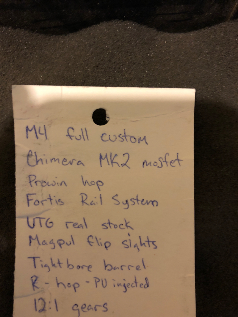 What I have here is a fully custom M4 AEG, built from the ground up with a Chimera MKii mosfet. This thing shoots with near perfection accuracy, excellent trigger response and utility. Selling it because it shoots too hot for the field I go to. Shoots 400-410 with .2. I don’t know the RPS, it’s sure as hell not a DSG but still puts in work. It’s more of a accuracy and trigger response build so good for outdoor play. Message me if interested. I can include accessories