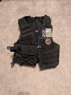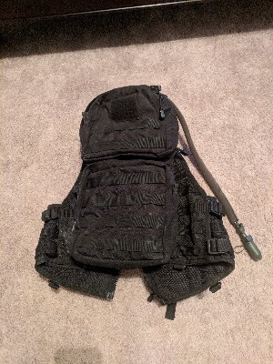 tactical 5.11 vest with molle all around. includes a backpack, hydration bladder and pistol holster.