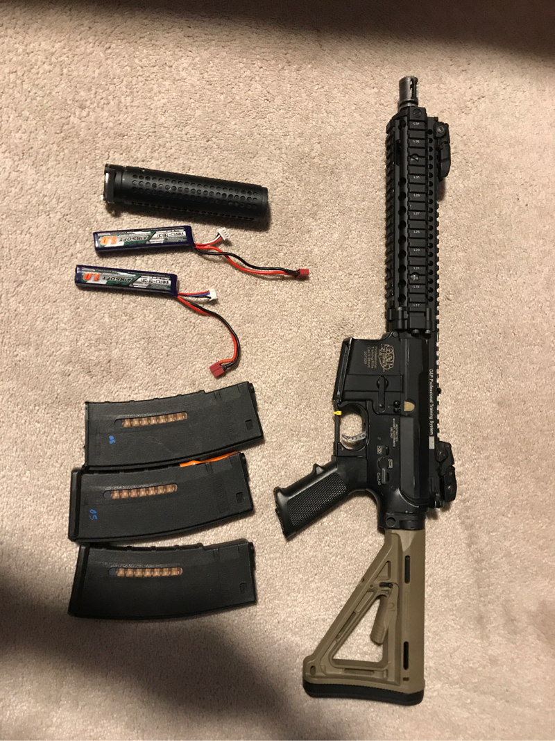 I want to sell my G&P mk18 it has been upgraded internal I have BTC spectre,motor is a high torque motor forgot the name. Externals I have mk18 rails mk18 grip speed trigger real mbus sight front sight one is for sure real not sure about the rear flip up sight, had a PTS moe stock and the hop is random but it shoots very very far further than all my other hop ups by far. It will come with 2 11.1 turnigy barriers, kac silincer and 3 mags. Only thing wrong is the mag release is popped out but still works it’s and easy fix if you would fix it. The gun is in good condition.If you have any question feel free to ask thank you.