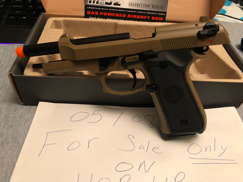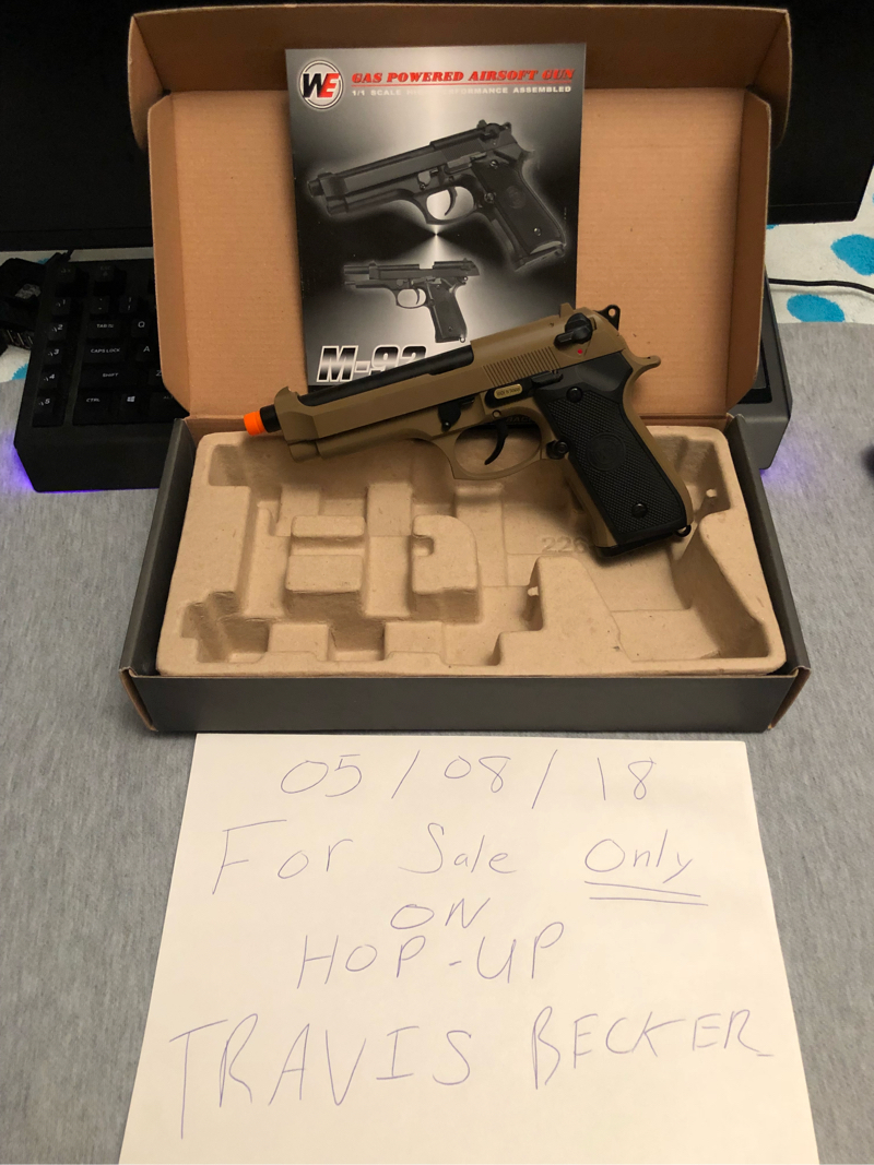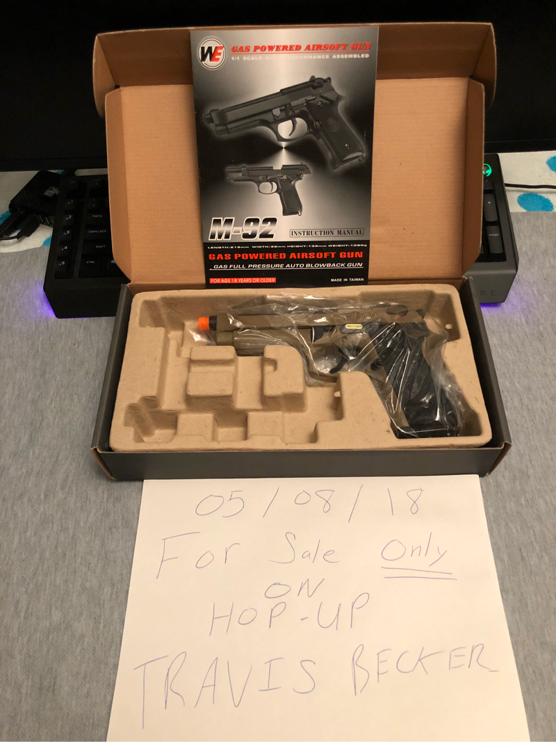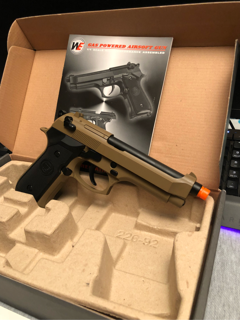 New WE Tech M92 Full Metal Gas Blowback Airsoft Pistol with original box, manual, and accessories.
