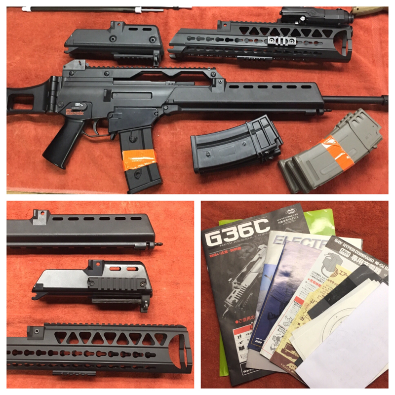 Tokyo Marui G36 AEG with 3 hand guards, 6 mid cap magazines, tight bore barrel (6.03) and a mock PEQ box for battery. Just an FYI..that’s just orange tape on the tip and mag.