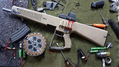 Looking to sell my modified AA12. First things first, yes I'm aware I cut off the sights and gave it a paint job. Never thought I'd be offloading it to be honest. We've got a Tokyo Marui AA12 here, with a few changes. The internal TM Mosfet committed Seppeku and almost took the motor with it, so it's been swapped with a GATE Nano Mosfet to keep everything protected. The rear sight plate has been modified, and a small rail mounted on the plate for a fairly flush optic mount. The sling points were taken off (loud and rattling), and the rear one can be reattached. The AA12 comes with five 93-round midcaps, as well as two (with original box) 3000-round drum mags. Looking for roughly $420 (blaze it) for this platform.