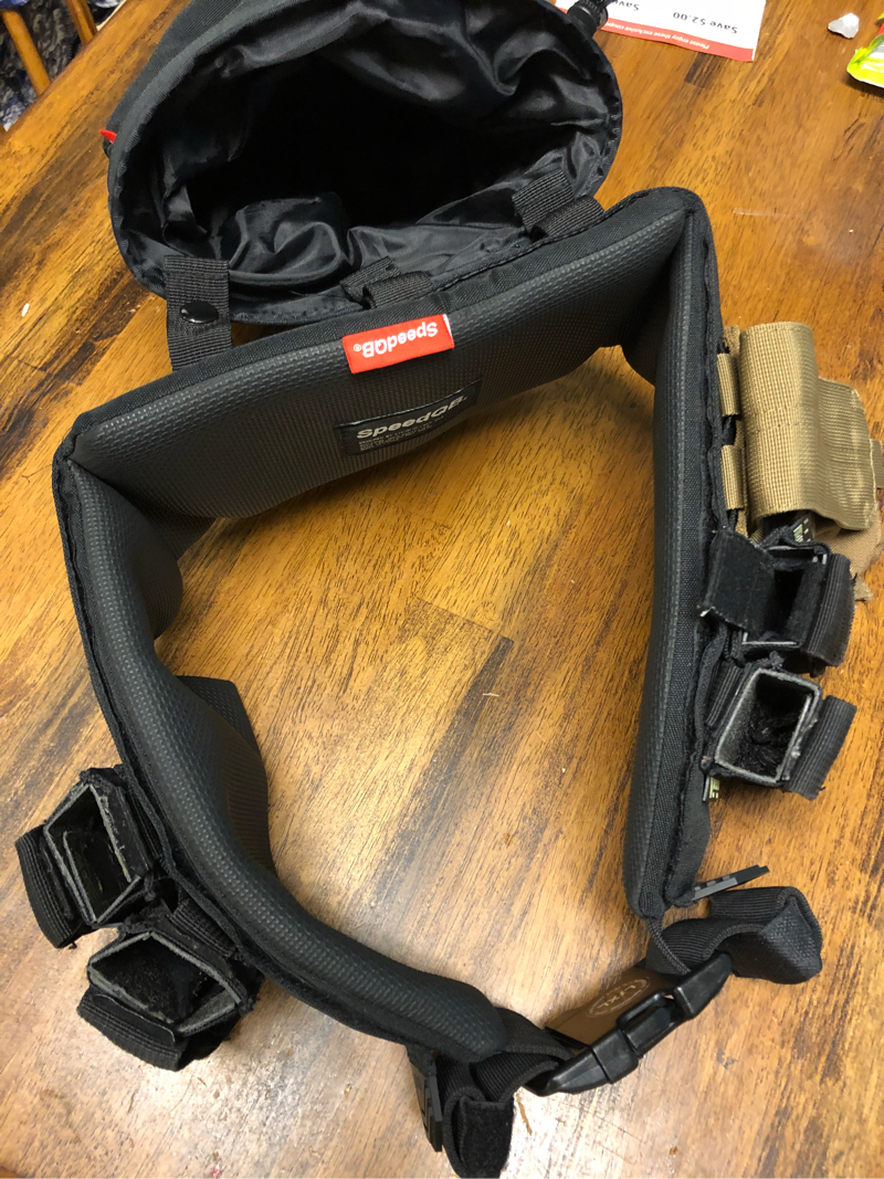 This is a original speedqb belt with the big dump pouch not the new smaller ones but it comes with four phantom gear pistol mag pouches and a random tan m4 or grenade pouch but the front buckle has a crack in it and a piece fell off and it is a large.
