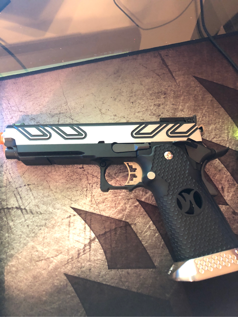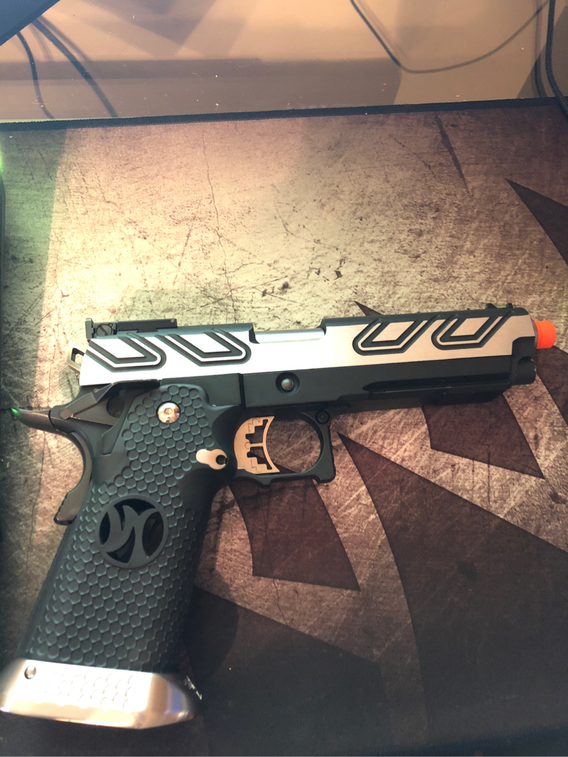 Hello! This is an Armor Works Custom Hi Capa 5.1! The only upgrade is that it is short stroked! The right thumb safety is not locking in place with the right one! Only trades are for TM Hi Capa 4.3! Shoots fine!