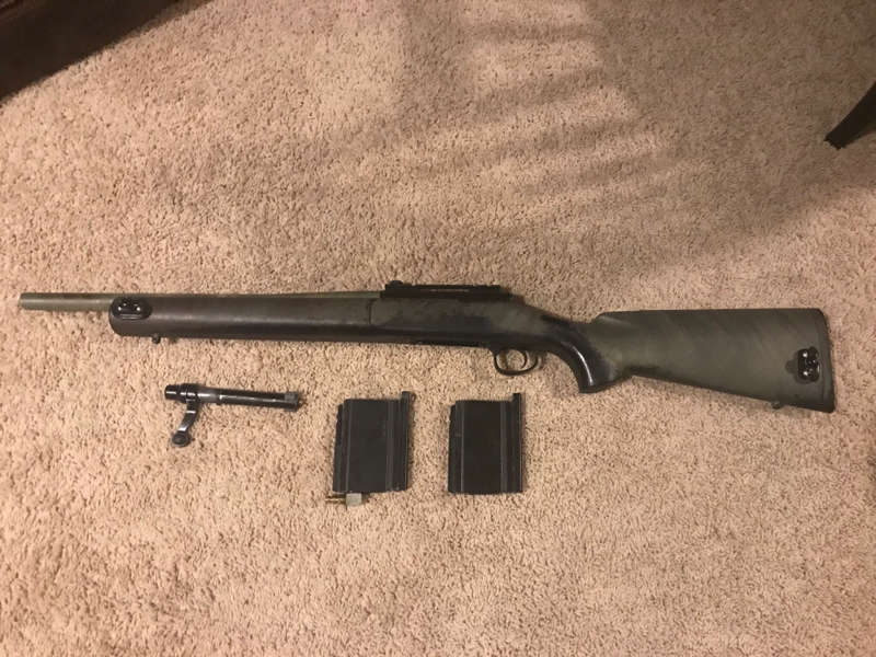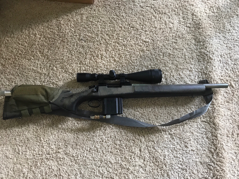 This is my kjw m700, highly custom. I’ve done about every DIY mod possible to improve consistency and accuracy and am very willing to send shooting videos on request. The gun has a custom hop chamber made after dobeys (cafe racing), a lengthier bolt nozzle for better air seal, a lambda custom 6.05x430 mm inner steel barrel, two action army 28 round mags (one hpa tapped) and a shimmed mag release to hold the mag gasket closer to the bolt for better consistency. This gun makes +/- 1.5 FPS on co2 in a palmers regulator. Also on request I can include the green gas valve for the hpa tapped mag. I’m looking for cash only as I’m changing to a lighter rifle platform. Please