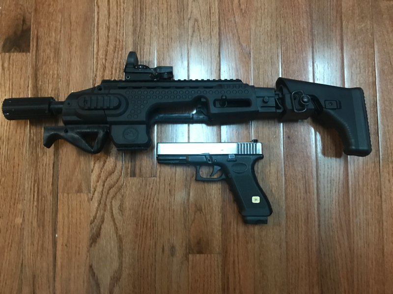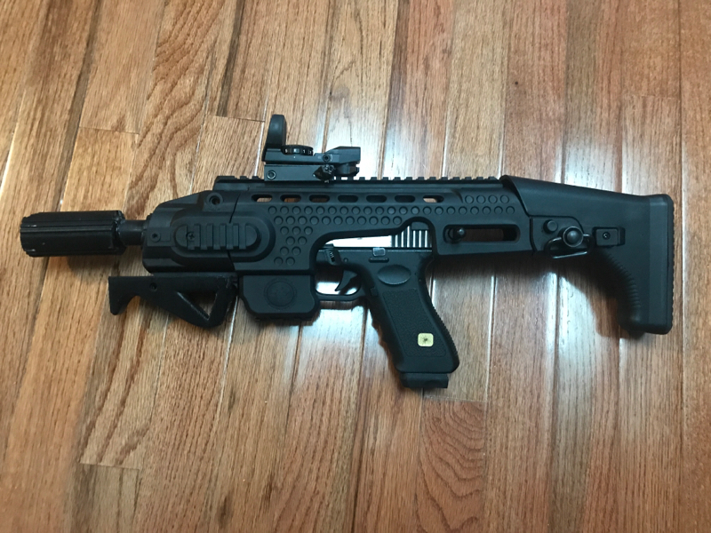 G17 w/ APS kit, 3D printed AFG, Custom 3D printed thread adapter, and 3D printed suppressor.
