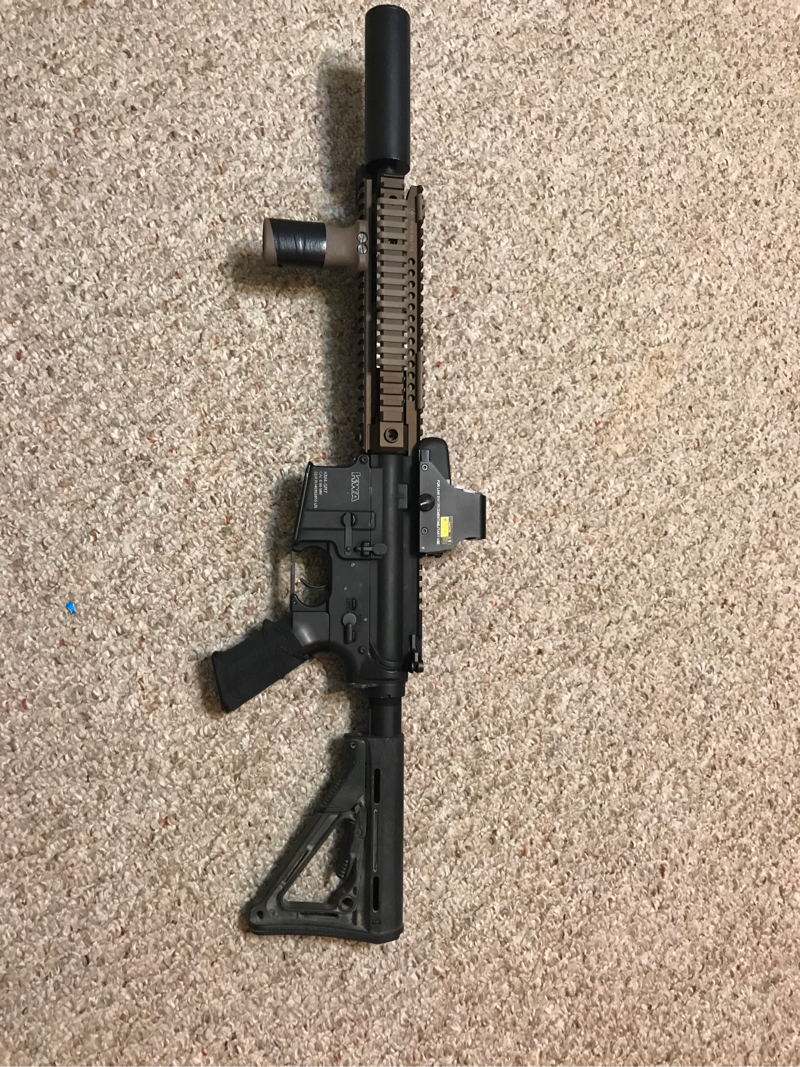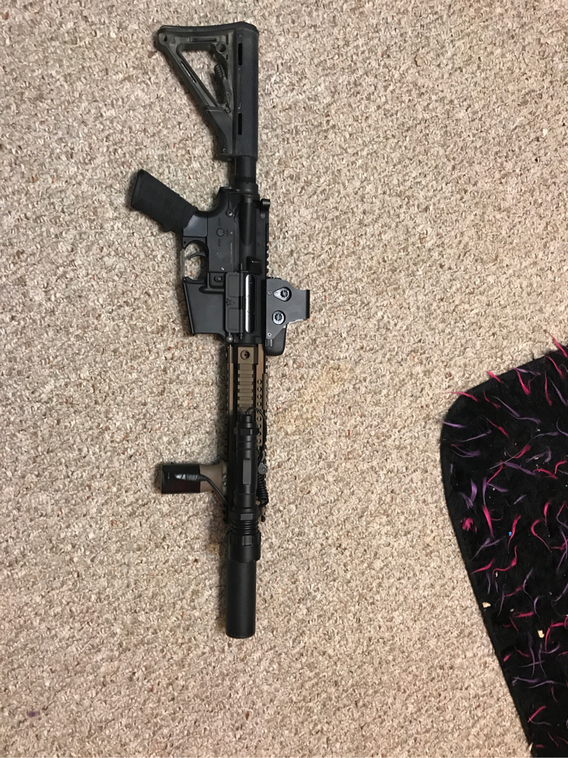 Madbull Tightbore 6.03 with Flathop Magpul Vertical Grip 400 Lumens UTG Flashlight with Pressure Pad Mock Suppressor Magpul CTR Stock Wired To Deans 7.4v LiPo Included Very Accurate and shoots great $300 Shipped