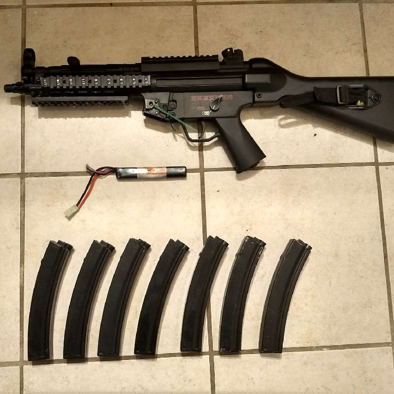 This Classic Army MP5 has a full metal upper receiver with a strong polymer lower receiver. The tri-rail system and upper receiver rail sections are fully metal with numbered rail segments. This rifle is fully functional and will come with a 7.4 lipo battery with a Dean's connector installed. 7 magazines will come with this rifle. The flash hider for this weapon is detached and missing a metal pin which locks it in place.
