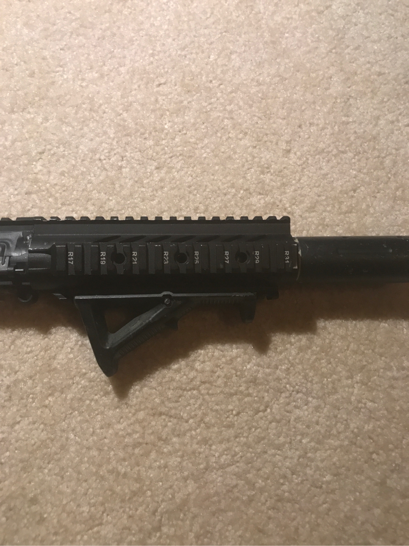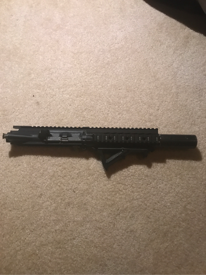Upper with metal rails, metal outer barrel, angled grip, and suppressor. Has G&g hopup and 6.01 inner. Yours for 60 shipped. Need $$$ fast. HMU for more pics. Has no charging handle to lighten the gun, and the door is taped shut.