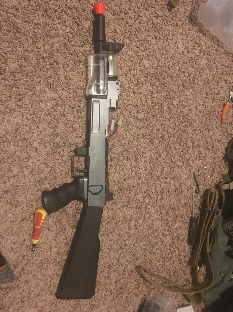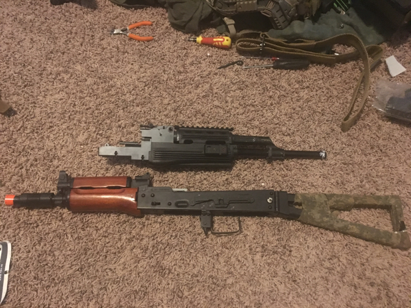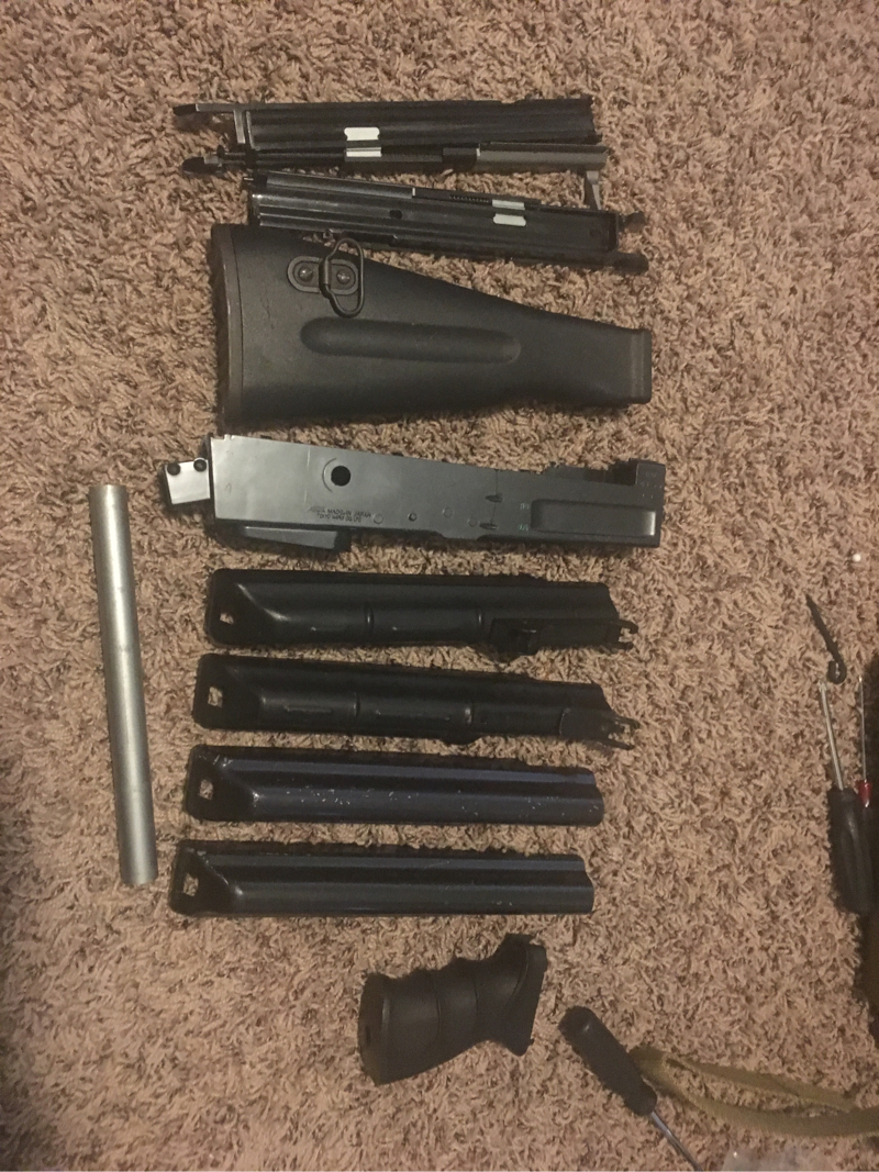 Selling a lot of ak externals, a complete cyma ak74u gearbox in a kalashnikov body, and a couple other random parts. 4 top covers all metal, tm ak lower, tm ak tactical fixed stock, 2 charging handle assemblies, grip, cyma metal and wood ak74u body and inner barrel assembly (top cover for that one is in the first pic), tm ak contractor front assembly and hand guard and outer barrel, etc, tm metal v3 gearbox shell no cracks little wear, tm v3 plastic hopup chamber, tm short type motor, and finally a meme gun body with a functional cyma v3 gearbox with src metal hopup unit and complete barrel assembly. Meme gun works great, just the external quality is meh. Also will include 4 pts high cap ak mags (ones is sort of broken) and I may throw in some other random internal or external parts depending on if the box has any more room. Just a good lot to build a simple ak that will work great and has some upgrade parts as well. Not parting out with anything, selling as a lot in order to to buy a ncpc. No swaps unless you live in Honolulu, HI. If the price is to high then just offer up, I don’t need this stuff just want it gone. Buyer pays shipping and PayPal fee, and you’ll probably end up getting more than what’s shown. Will swap over shipping though only for a nice plate carrier setup, I would prefer you ship first but if you’ve got a good amount of vouchers we could work something out