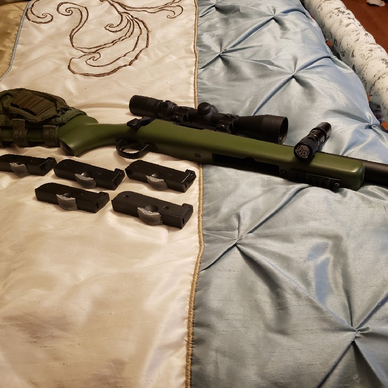 It is a MB03 from wells with a Wolverine Bolt HPA system in it with a hard line and battery wires run to a side bag. It has a 602 barrel and all weather nub in it. The trigger has been tuned to zero. I also have a CO2 adapter for it (minus th regulator which you can get at wolverine). I usually shoot .32 or .40 out of it at about 85 yards accurately. It has a simmson white tail classic 3.5-10 X 40 scope with riser mounts. Five mags with 3d printed grippers