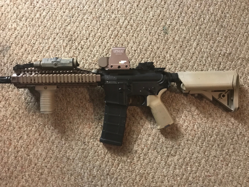 Fully functional G&G CM18 (MK18). Comes with mag, flip up sights, foregrip, rail covers, PTS motor grip, peq (hollow shell) and M3X with pressure switch. Eotech NOT included or for sale. $175 shipped, $140 without the M3X. NO trades please.