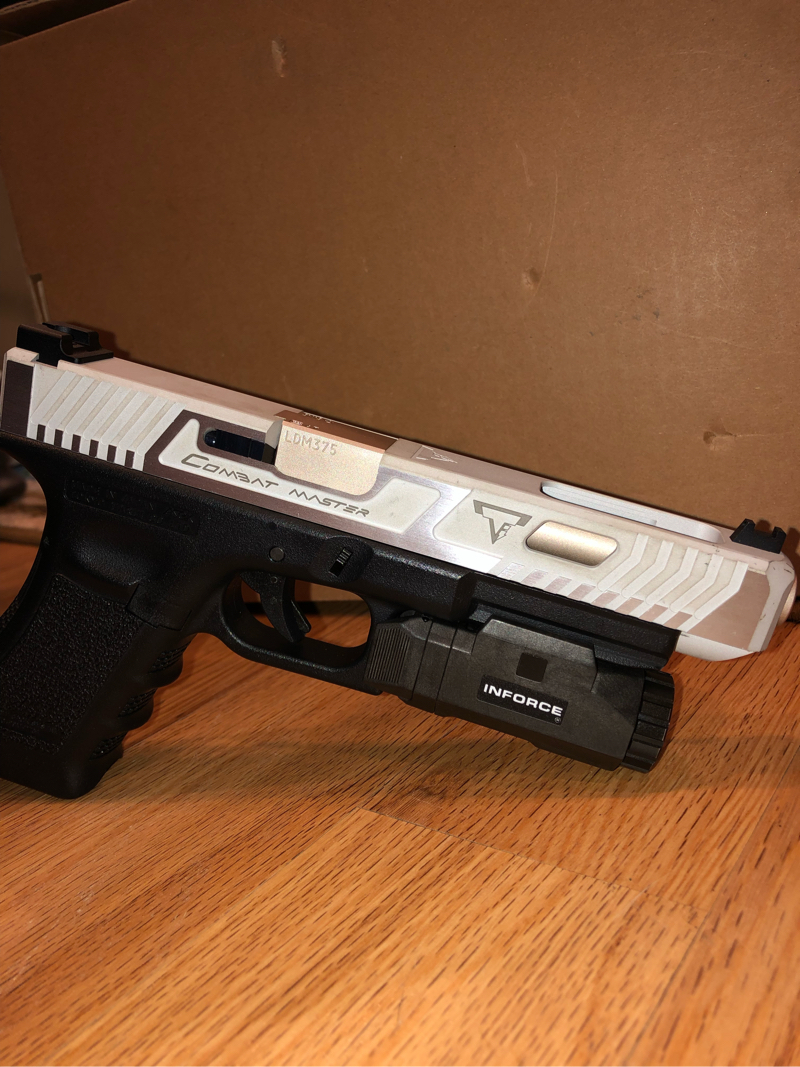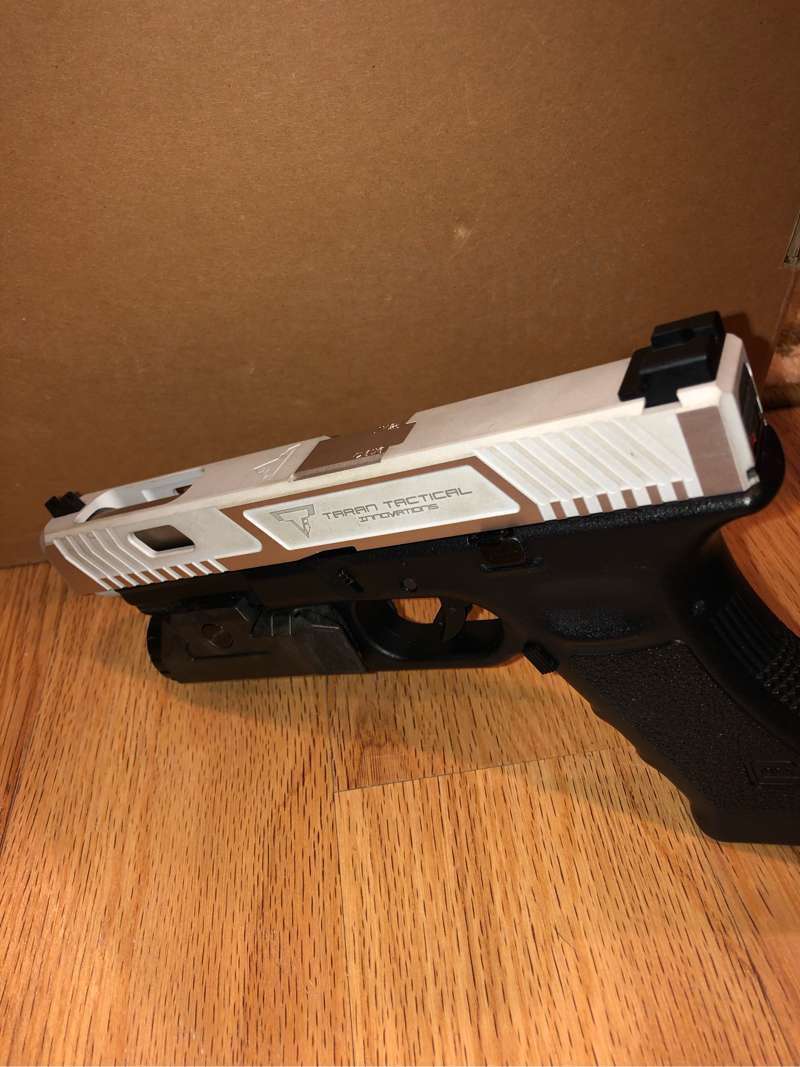 Price is shipped White taran tactical slide with metal rear sight and metal front fiber optic (missing the fiber) and bronze-ish metal barrel All of the internals are stock Tokyo Marui plus an AIP %120 nozzle spring