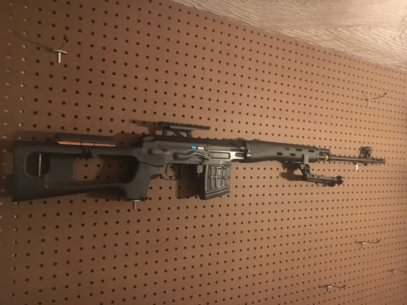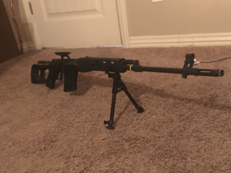A bolt action SVD, upgraded piston and cylinder set. Comes with AK style rail mount, 2 mid cap magazines, and a bipod. ~500 FPS with .20 gram bbs but recommend .36 gram