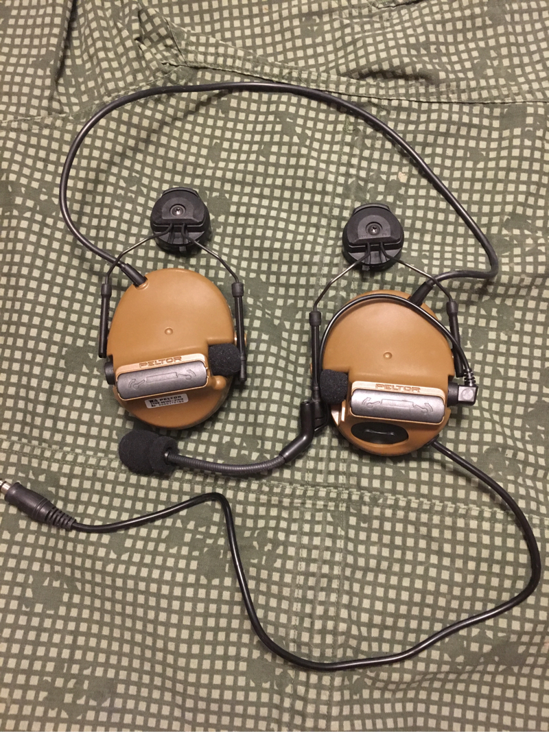 Like new replica peltors with the 3M arc rail adapters. The color on these things is spot on to the real ones. It even has peltor trades. Really good option for you impression guys.