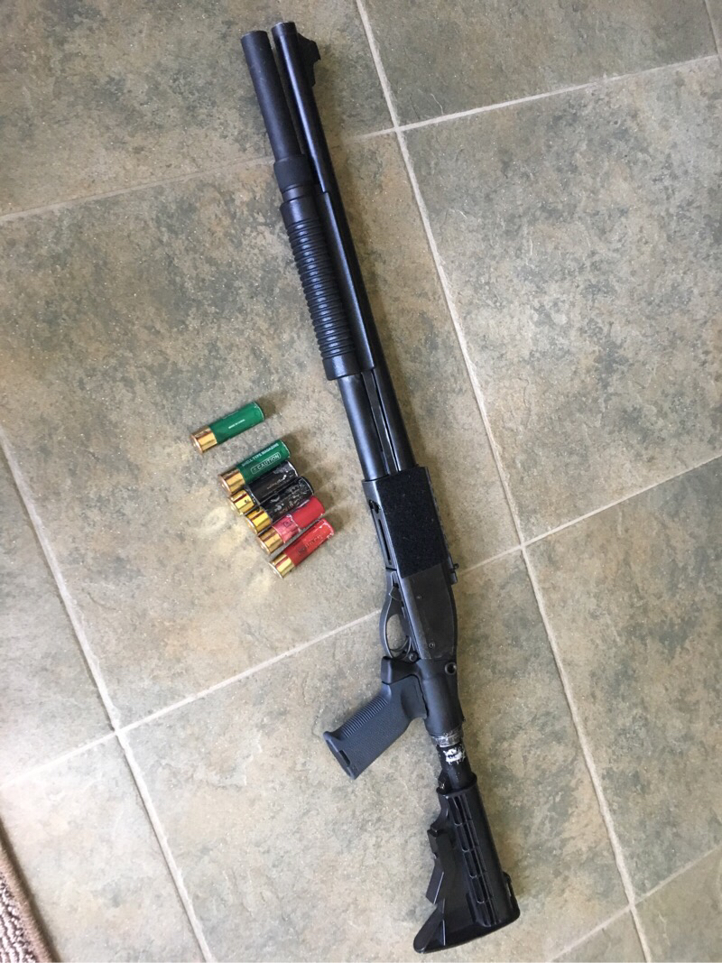 This is a solid shape, well functioning Tokyo Marui M870 with 6 shells, an Angry Gun M4 stock adapter with a Magpul grip and LE M4 stock currently mounted. (Both modified to fit.) As well as an after-market shell-tube extension. Not sure if this is the Wii, G&P, Angry Gun, or what. But it’s solid and mounts well. Also has a piece of Velcro mounted to the left hand side, so that shell trays/strips can be used.
