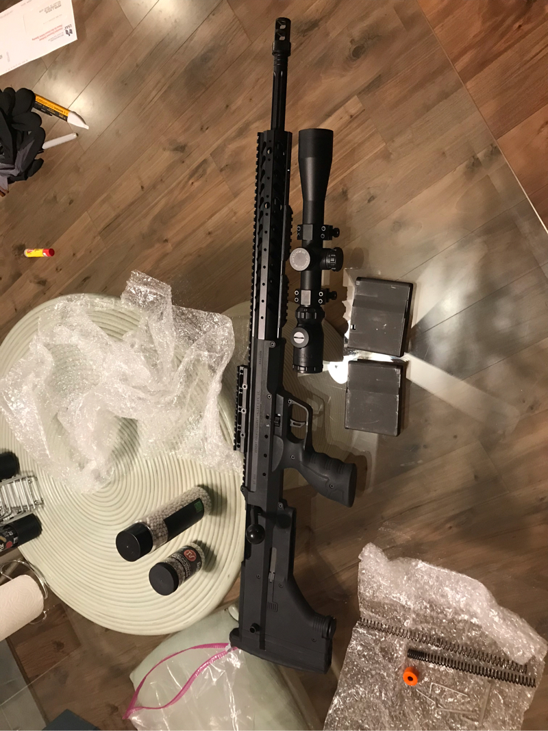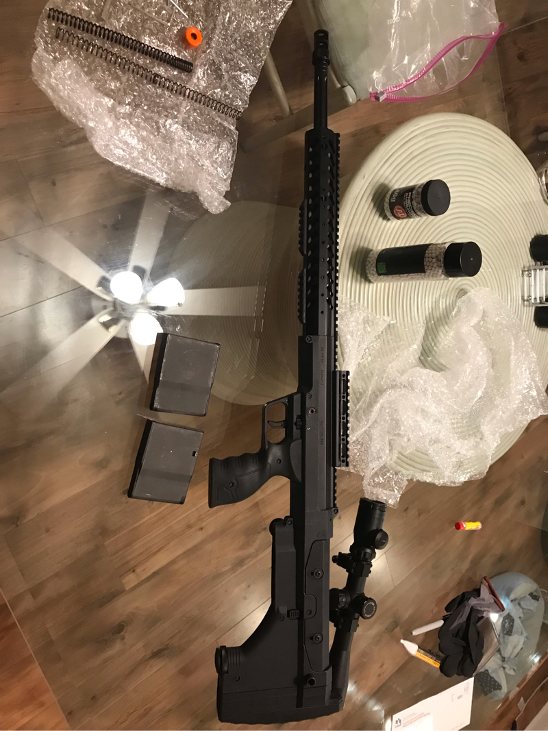 Barrel is stock except the hopup nub and actual hopup, the outer barrel is 14mm net and has a black .338 comp on it but can take suppressors and such