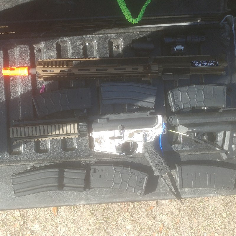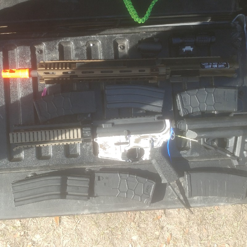 The gun comes with two uppers, the gun(and yes you can remove the paint with paint thinner or nail polish), 4 mid caps, one hi cap, one fat mag, 7.4v mini lipo, and if your a speed softer a nice green and purple paracord sling.