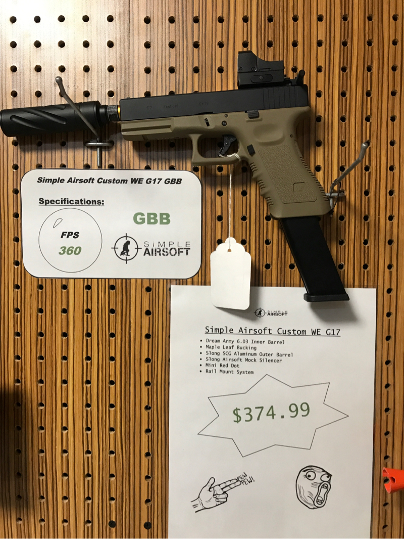 Simple Airsoft custom built we g17 GBB. Brand NEW. 6.03 inner barrel, maple leaf bucking, outer barrel, silencer, mini red dot, mail mount system, extended mad and regular mag included.