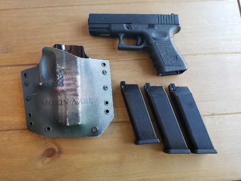 WE Glock 19 Gen 3, 2 G17 mags, 1 G19 mag (leaks where you fill it but works), and a kydex holster. $125 shipped