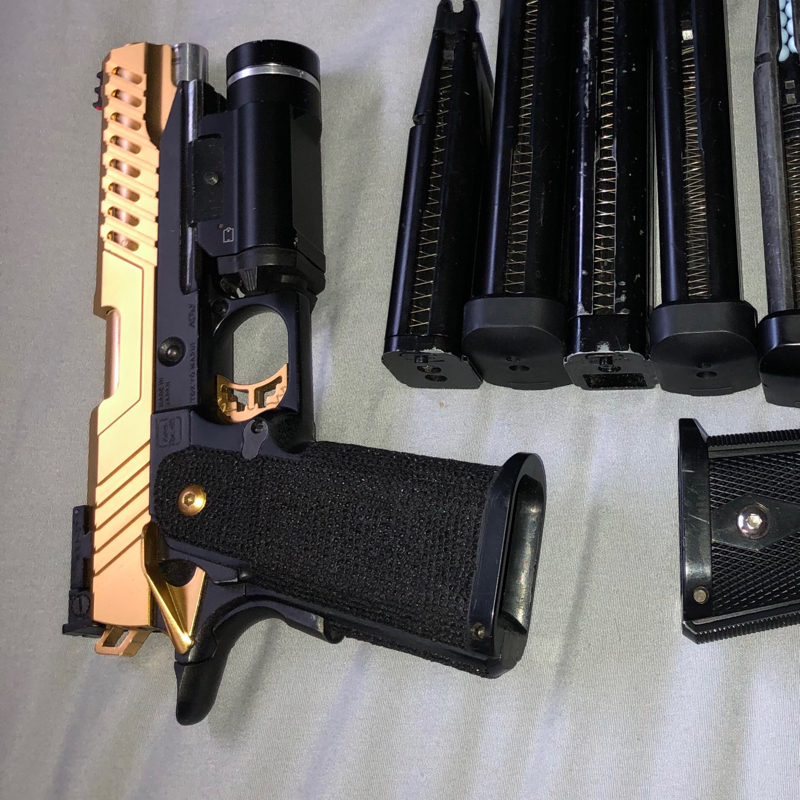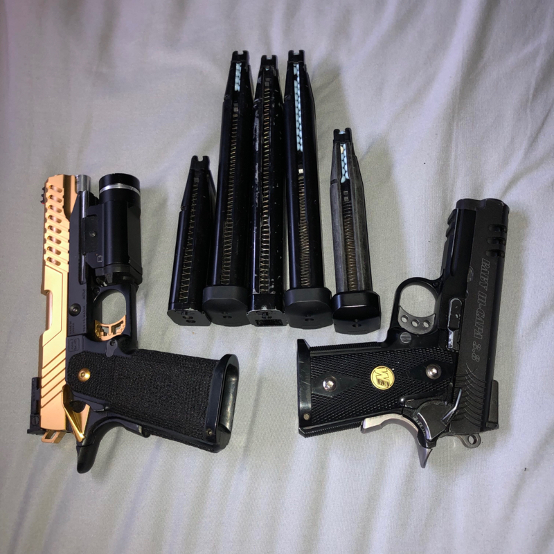 500 for everything in the picture Left pistol is a tm gold match with a airsoft masterpiece slide 125% recoil spring Right pistol 3.8 baby hi capa In the puddle three extended mags and two regular mags HMU for offers on just one of them