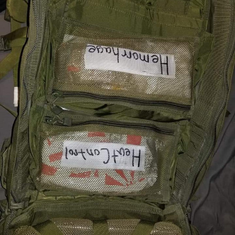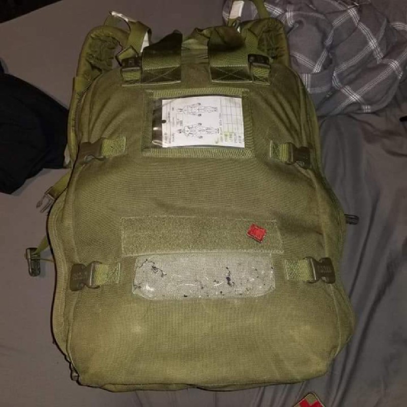 OD Green Blackhawk S.T.O.M.P trauma bag, features two large pockets with various zippered pockets, and webbing for supplies.