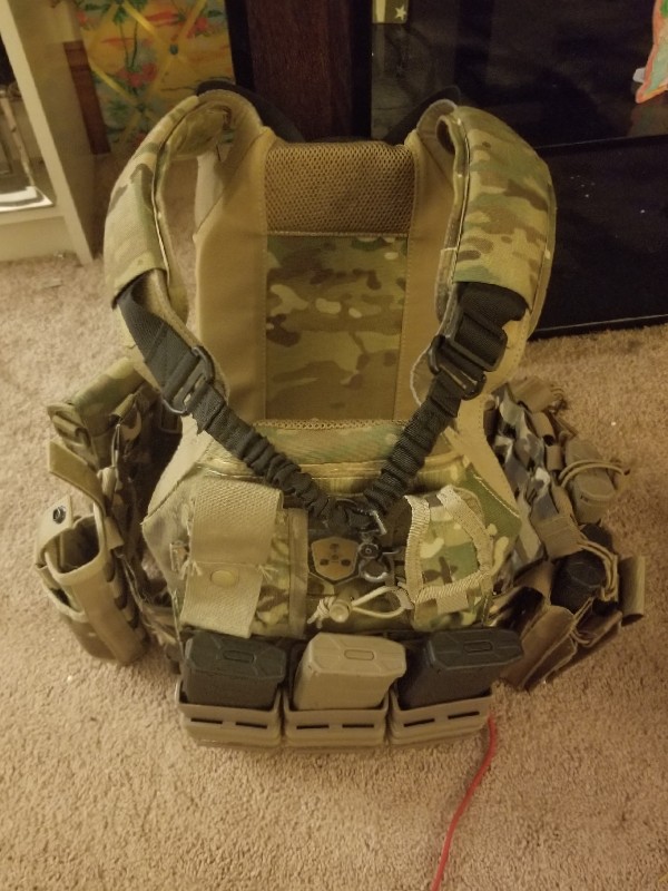 Selling my mc jpc that comes with the dummy SAPI plates in them. 6 total mag pouches on it, 3 hard shell ones in the front and a 3 mag pouch on the left, black bungee 1 pt sling, 40mm grenade pouch and a radio pouch above the 3 mags in front, pistol holster, xl shot gun shell pouch, and a black tactical bag on the bag which has molle all over it. Good amount of money put into this. $120 includes shipping and fees no trades