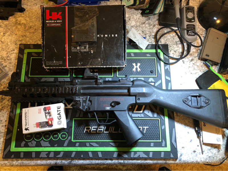 It features a SHS CYLINDER HEAD AND NOZZLE, CYMA METAL RACK PISTON, GATE HARD MOSFET. Shimmed and AOE corrected. Wired to deans. Comes with the gun, HARD programming button and single lead wire, 10 mid cap mags that don’t fit the best in the mag well so you’re getting those for free basically. They do work and feed bbs. M4 to mp5 mag adapter. Why you might ask and I really have no idea I just don’t want it anymore.