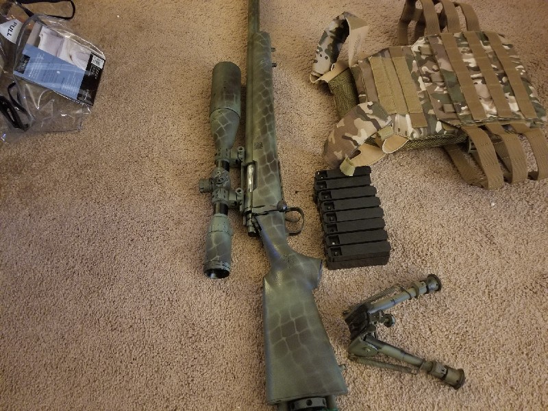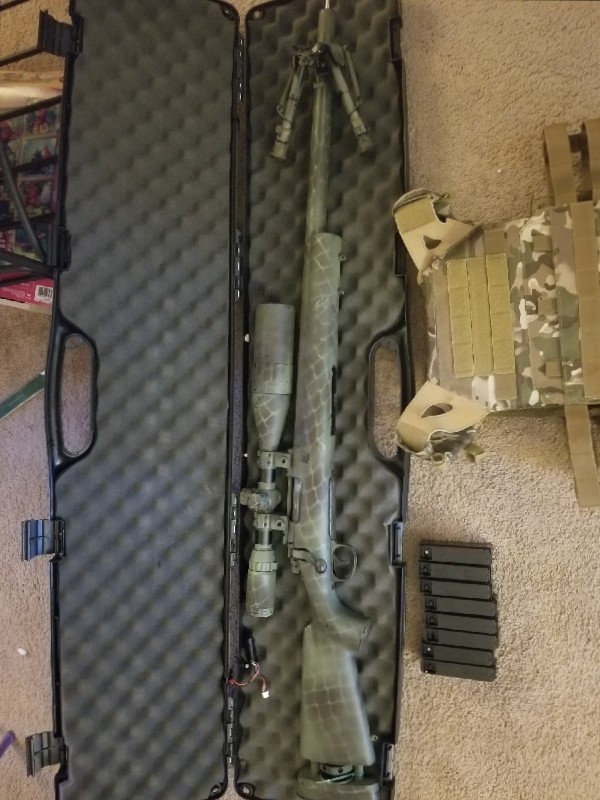 Echo 1 m28 was the best out of the box sniper rifle ive seen thats not in the pre upgraded category. It was shooting around 480fps w/.20 then. Some upgrades that this beauty has is a**EDIT now has MadBull Black Python tight bore not thePrometheus tigh bore inner barrel 6.03 517mm, madbull shark bucking, SPEED alum tunable trigger black, SPEED precision trigger sears, m150 spring installed also comes with a m130, m170, AA spring guide, AC Advanced PSS2 piston, AC Power Accuracy piston Head, AA barrell spacers, PDI Hopup chamber, AC cylinder and cylinder head, custom paint job along with the scope and bipods were painted to match as well. This rifle is an absolute dragon slayer chronod 532fps with .2, was 398fps with .48s which is what i run in it and 300 ft shots? Easily! I have a indoor/outdoor range at my house(serious buyers ill share pics of) the field has a tree line at the end of it first big tree we measured at 302ft and this rifle hits that tree while the bb is still in its effective range and its doing it with.48s. It comes with custom painted 6-24×50aoe custom painted scope, custom painted bipod, 8 mags, the 2 extra springs, a threaded barrel adapter for a suppressor and a 10inch foam filled suppressor plus shipping and fees included all for only $275 .rifle and all that comes with is used and works as it should. No trades