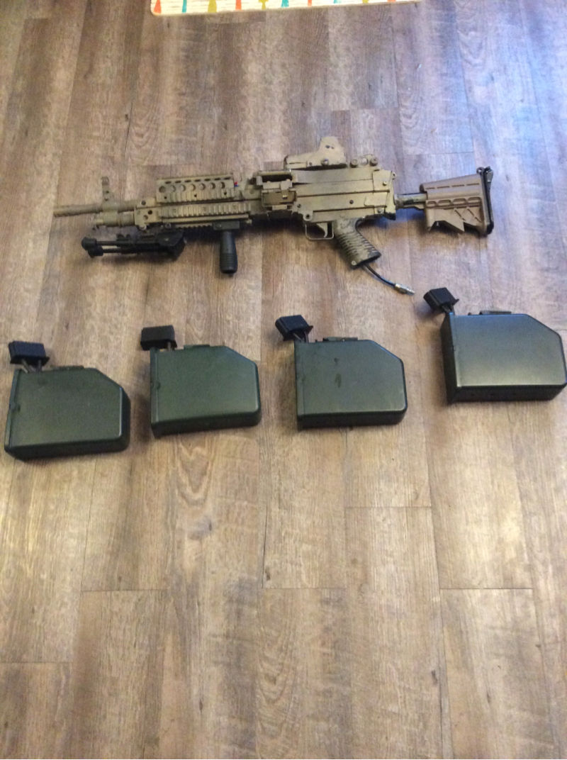 Comes with the suppressor and regular flash hider. 3 CA drum mags, peq box, and holo sight. It’s the newest gen kit and has only been fielded 3 times. Also comes with everything needed to convert it to a MK48 minus the correct box mag. No trades unless it’s real steel, night vision, thermal scopes, etc. No Airsoft stuff period