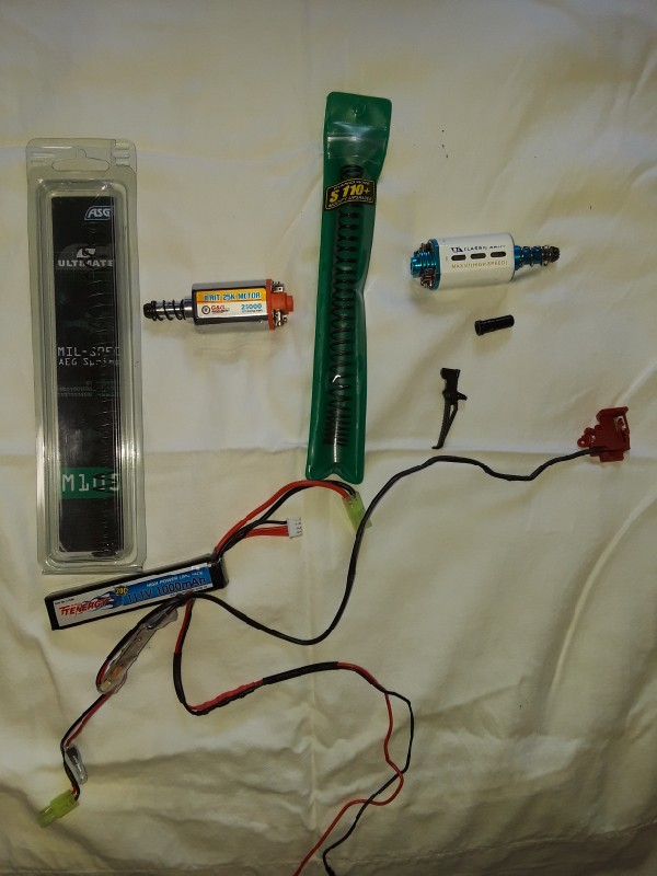G&G 25k motor - $20 ASG M105 Spring - $5 S110+ spring- $5 11.1 lipo - $20 M4 Nozzle - $5 $45 SHIPPED FOR EVERYTHING Add $5 for shipping if purchasing item individually