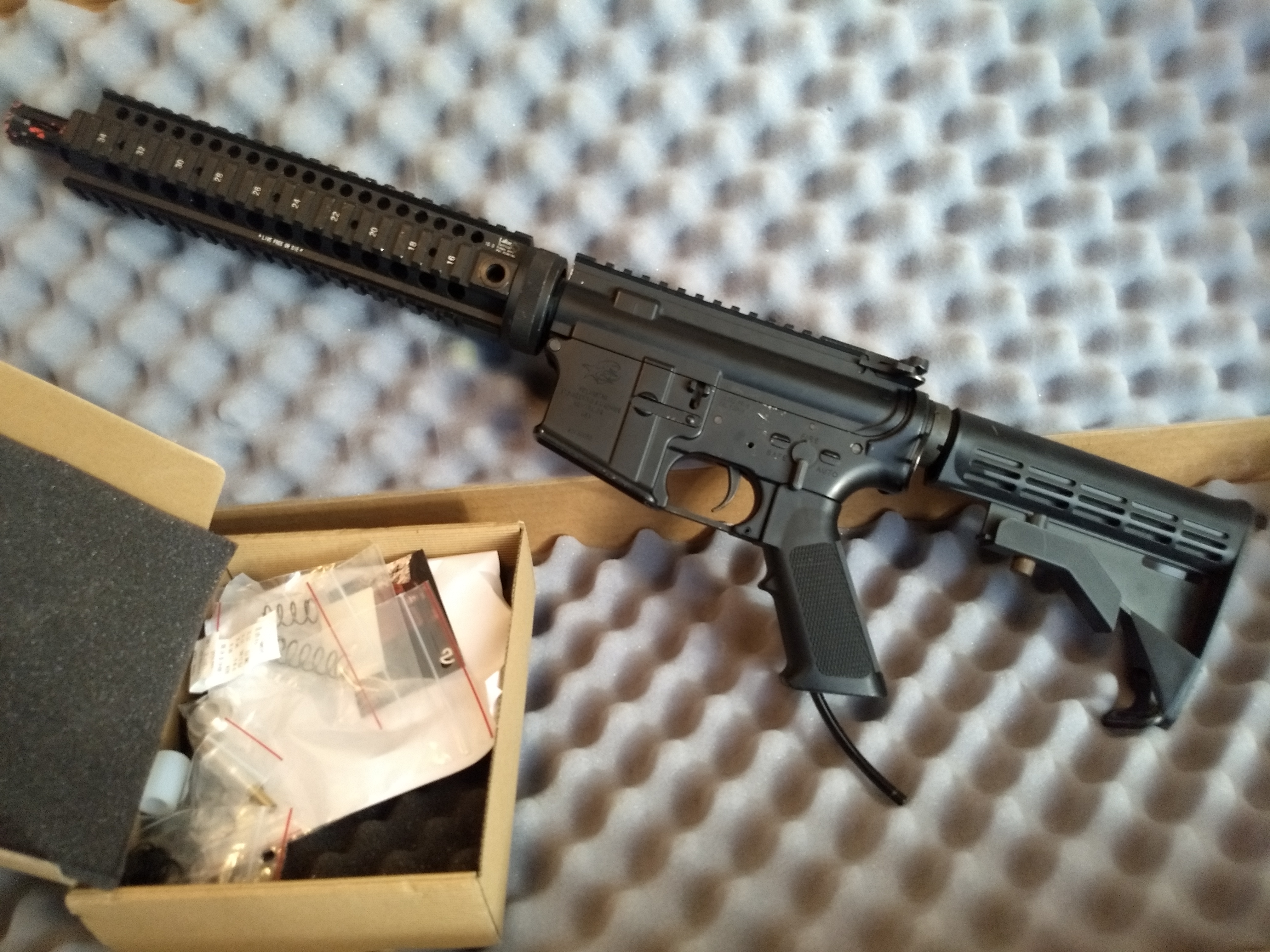 This is a parts bin build. ACM Larue RIS, Polarstar receiver set, and a bunch of random AR parts. Because of this, it has no mock bolt. Internally, it has an older gen Mancraft PDiKs (when they were still in JG gearbox shells). Works great. If you're not familiar with it, it's a semi-only, mechanical HPA system - kind of like a Redline milsim. Due to fitment issues, the trigger pin does not fit. The safety does not work either, and I don't remember why. It gets good range - iirc, it's got a lonex hopup and barrel in it.