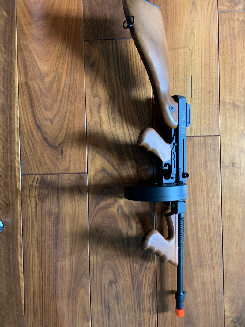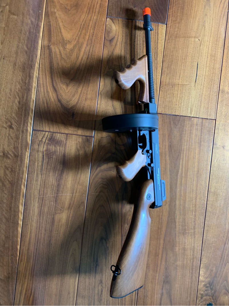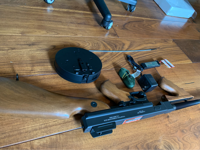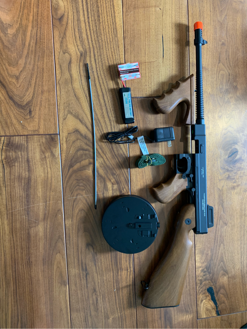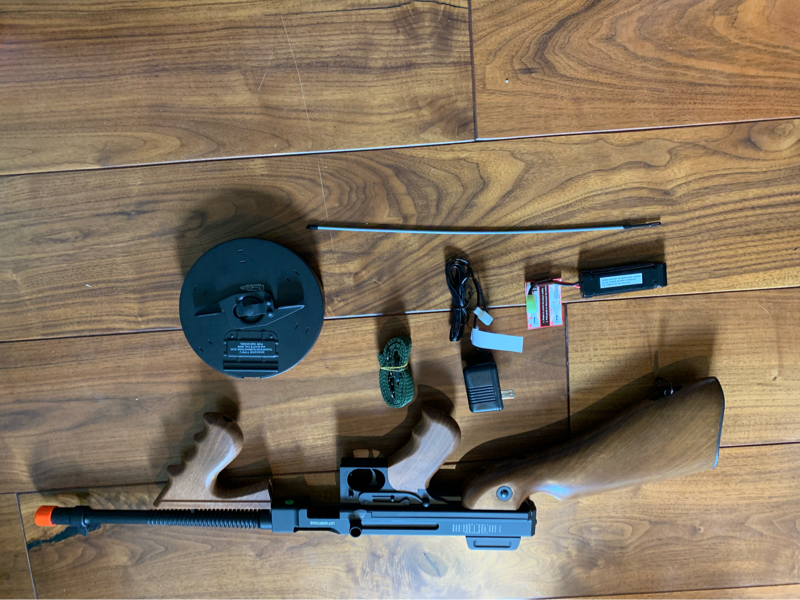 Brand new. Never used, never shot. Received in BOA. Cybergun. Full metal body/internals and wood furniture. Includes everything seen. Drum mag, charger, batter, sling, cleaning rod etc.