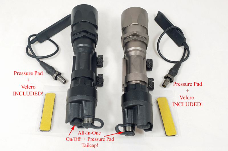 Comes with on/off + pressure switch compatible tailcap, Pressure Switch, and Velcro!