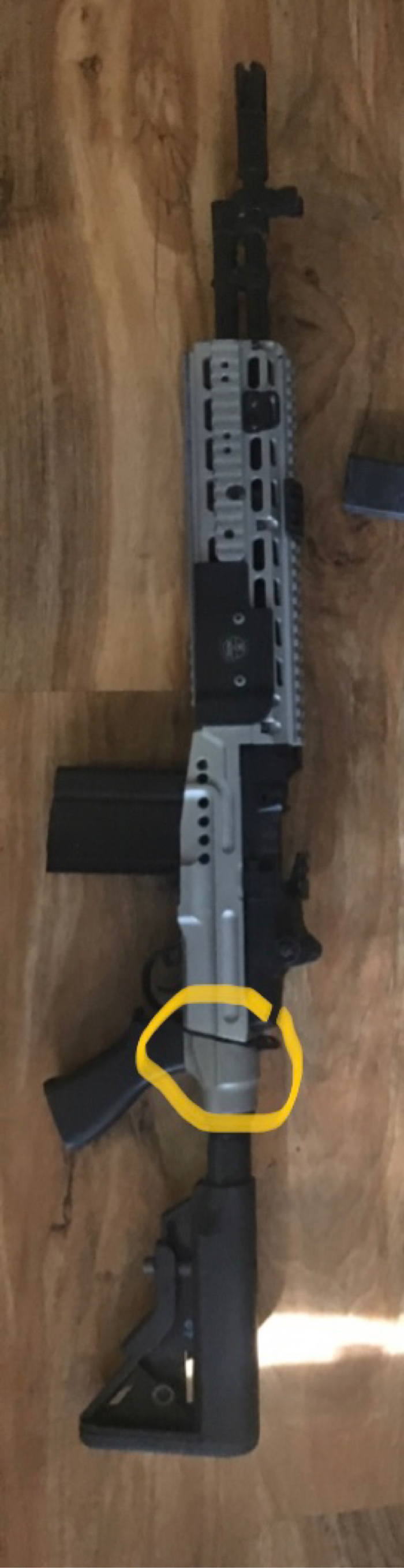 Cyma EBR - Works great but the part by the stock broke, can prob easily be JB welded or something. I circled the part.