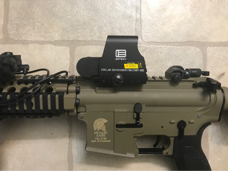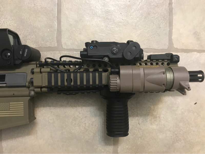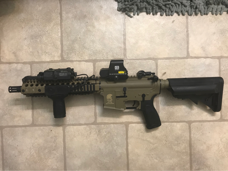 Matrix receiver with full metal MK18 rail. Gearbox is upgraded V2 with microswitch trigger and quick change spring guide. Externally it comes with everything pictured. Peq with light and laser, replica eotech, M3X with dual pressure switch, replica Eotech, rail cover and whatever else I forgot that’s pictured. Price includes 2-3 day Priority shipping. NO trades.