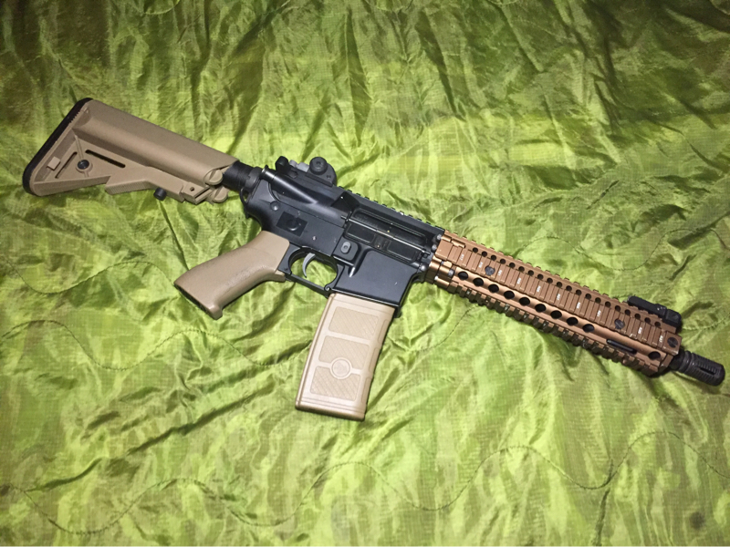G&P Mk18 licensed by Daniel Defense. Features the new i5 gearbox and a quick change spring. This will not function with anything other than a 11.1v battery just FYI. I currently have a Prometheus tbb and prommy purple bucking. The only caveats are that this unfortunately cannot fire in full auto however has an excellent fire rate in semi (something must have shorted out for full auto to not function) and the rail system has some wear and scratches on it. I am accepting any working AEG VFC scar H trades. Price is shipped.