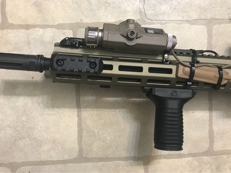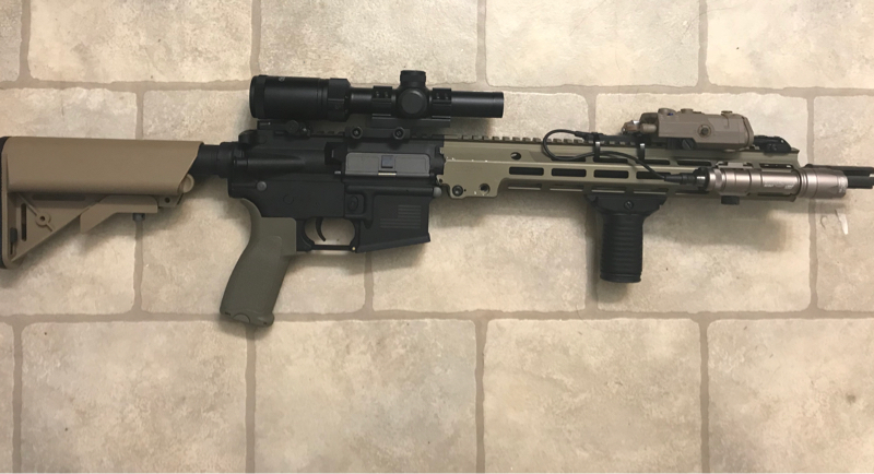 Matrix M4 with microswitch trigger, quick change spring guide and upgraded V2 Lipo ready gearbox. Comes with 13.5 trademarked Geissele replica 13.5 URGI rail. Rail is a little beat up but. Dytac motor grip, rail sections and foregrip. NO other attachments included. NO TRADES, NO PARTING, requests will be ignored.
