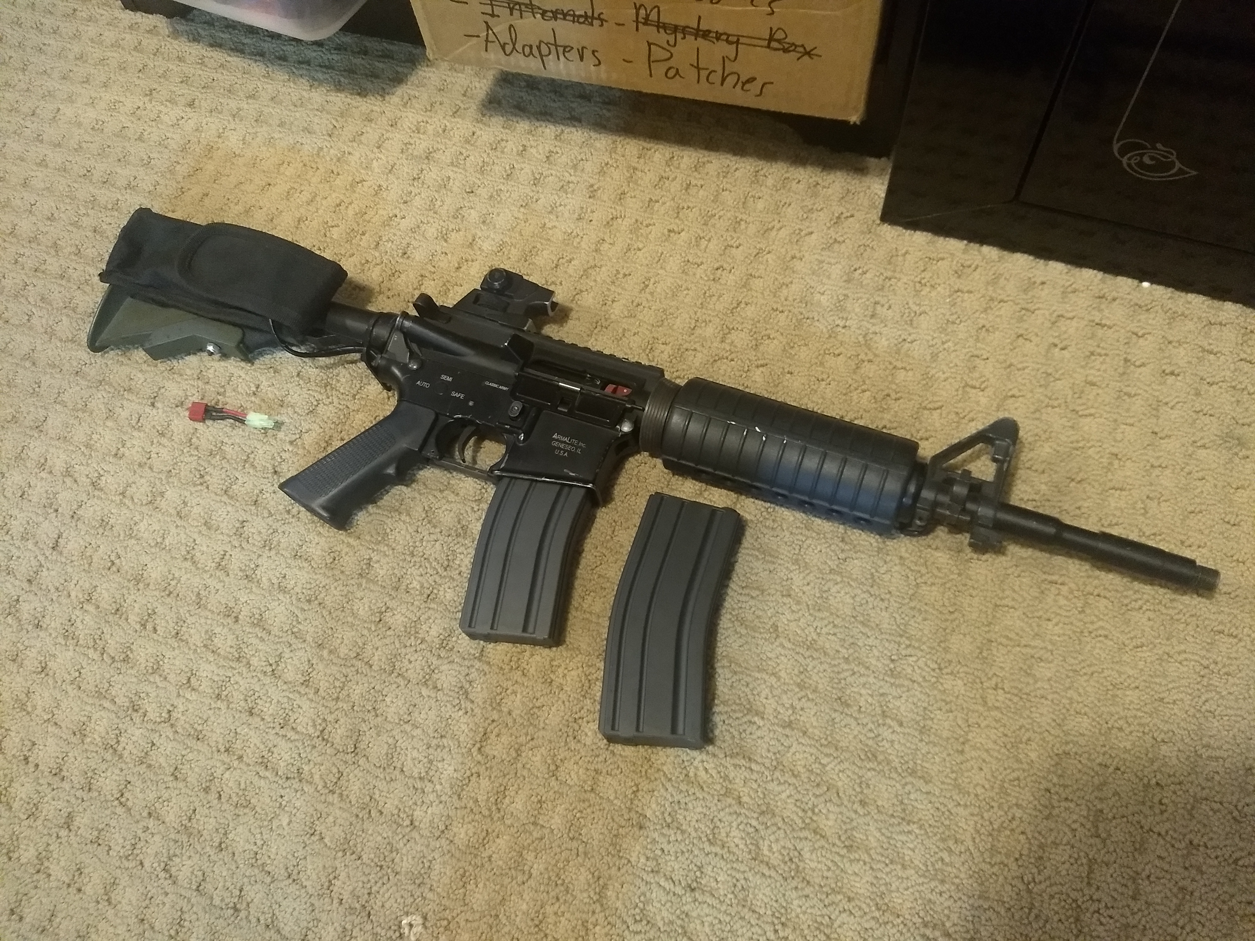 This started off as a boneyard Classic Army M4 Carbine which was rebuilt internally. Full parts list below, but all the externals are stock Classic Army, with the sight handle chopped off and the CAR15 stock painted OD green. Wired to the rear with a battery pouch for beefier batteries. Also wired to deans, but a Tamiya adapter is included. 2 MAG brand Midcaps also included.