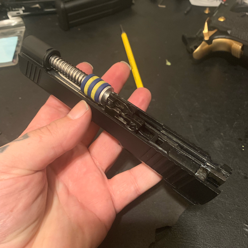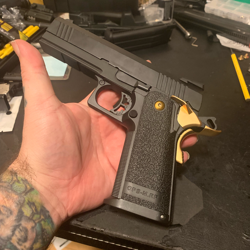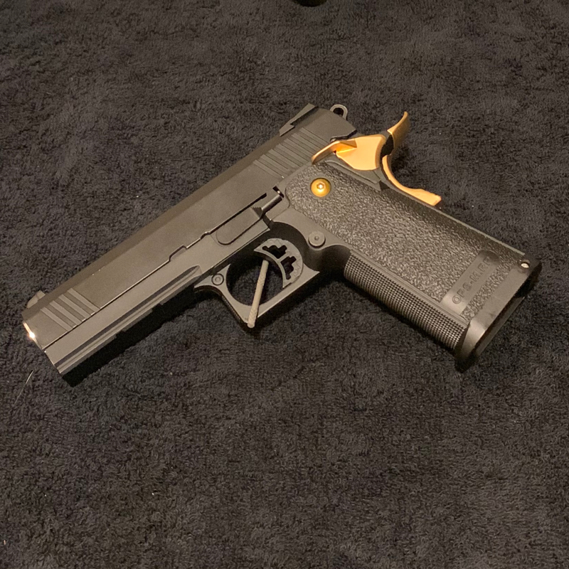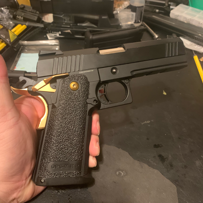 Matrix 4.3” Hi capa with gold AW safeties and Tm gold match grip screws. Short stroked. Recoil spring upgrade. Comes with 1 mag. New never fired $75 Buyer pays PayPal fees and shipping